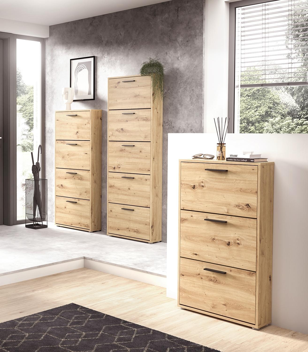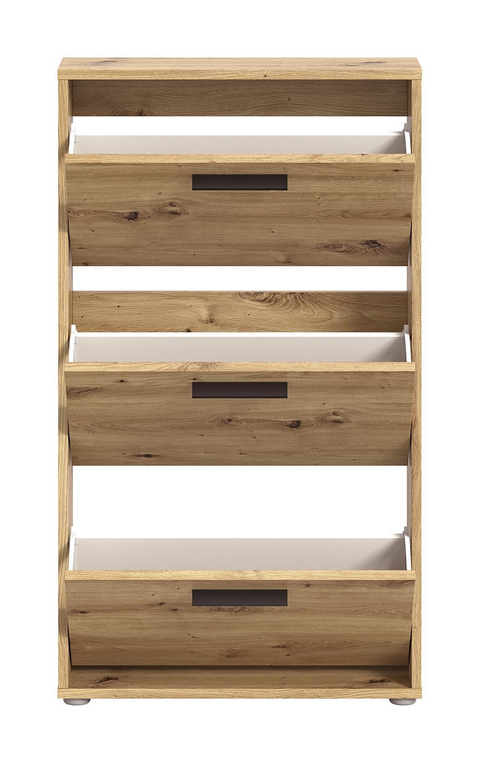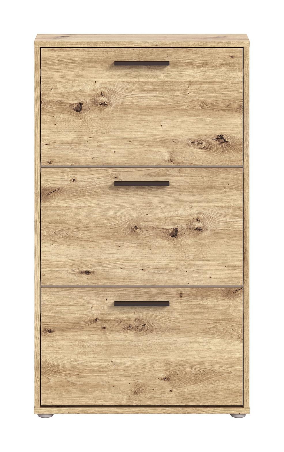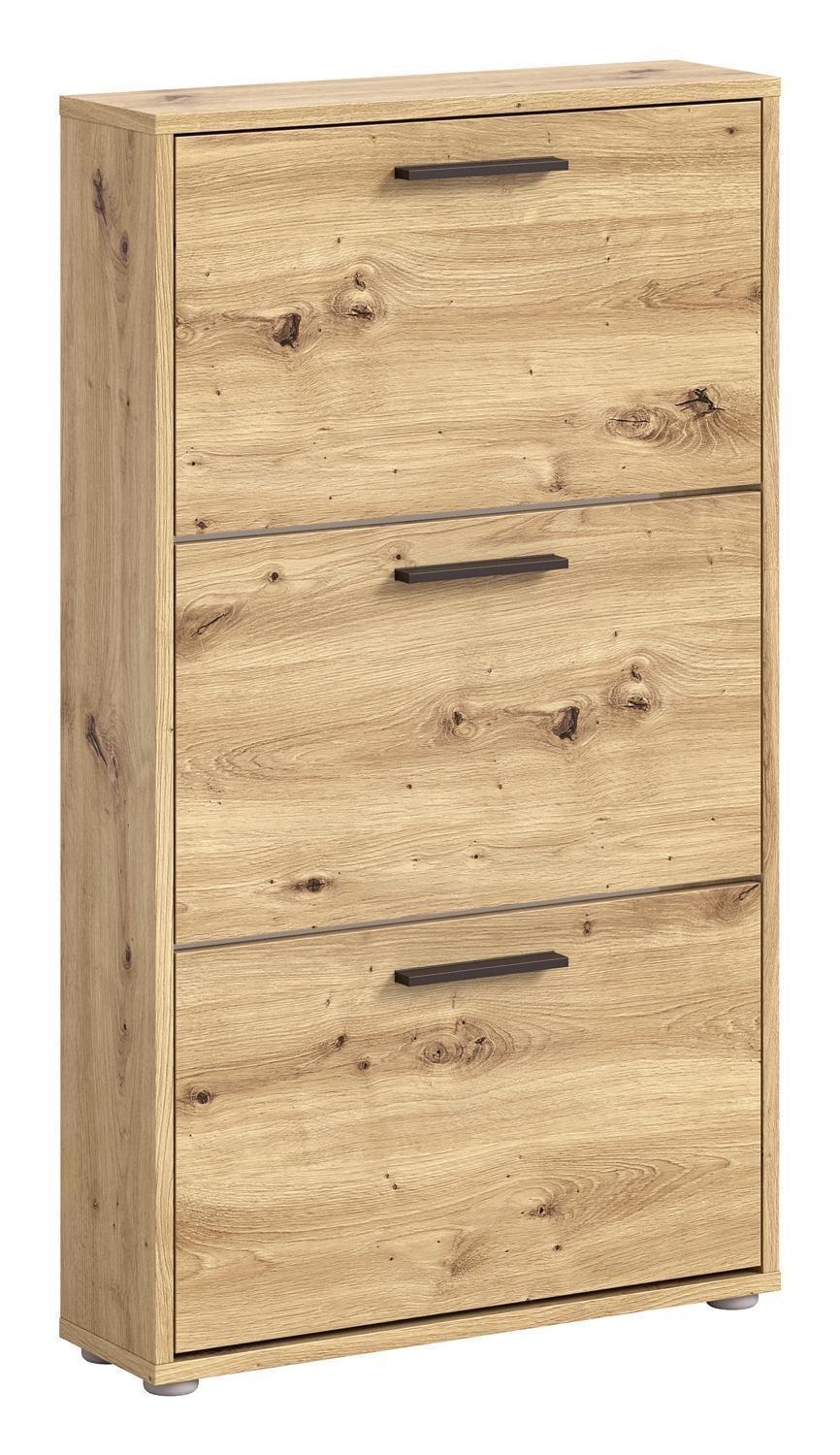 Der Schuhkipper SIRA ist ein praktisches Möbelstück zur platzsparenden Aufbewahrung von Schuhen. Er ist in Artisan Eiche Dekor gehalten und verfügt über drei Klappen, die einzeln geöffnet werden können. Der Schuhkipper bietet Platz für bis zu neun Paar Schuhe. Mit einer Breite von 59 cm, einer Höhe von 103 cm und einer Tiefe von 17 cm fügt er sich platzsparend in verschiedene Wohnbereiche ein.