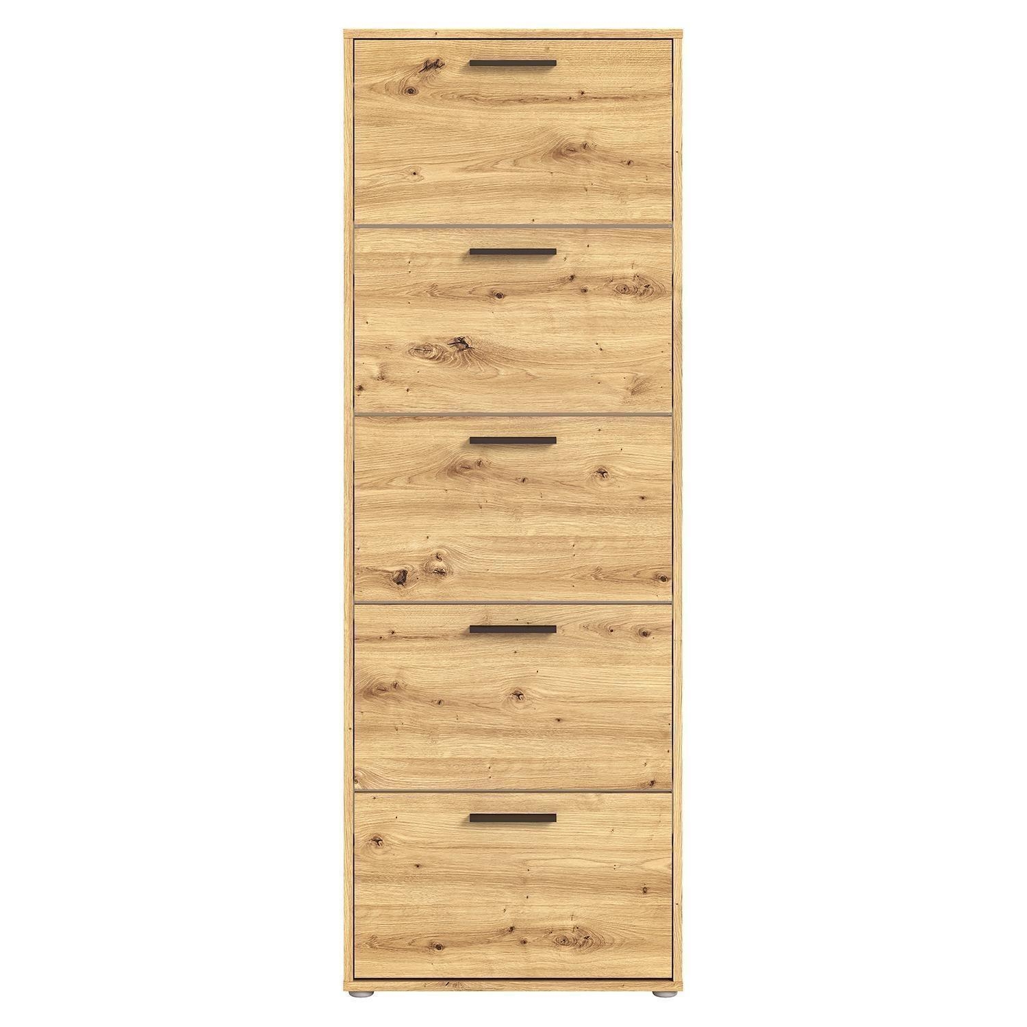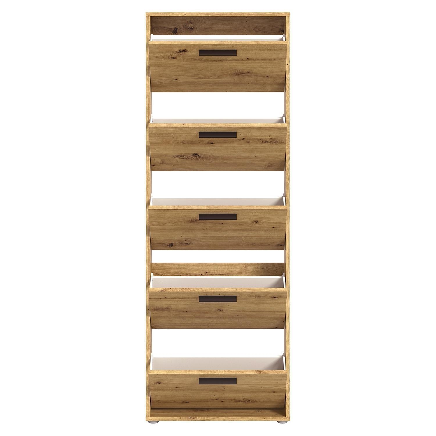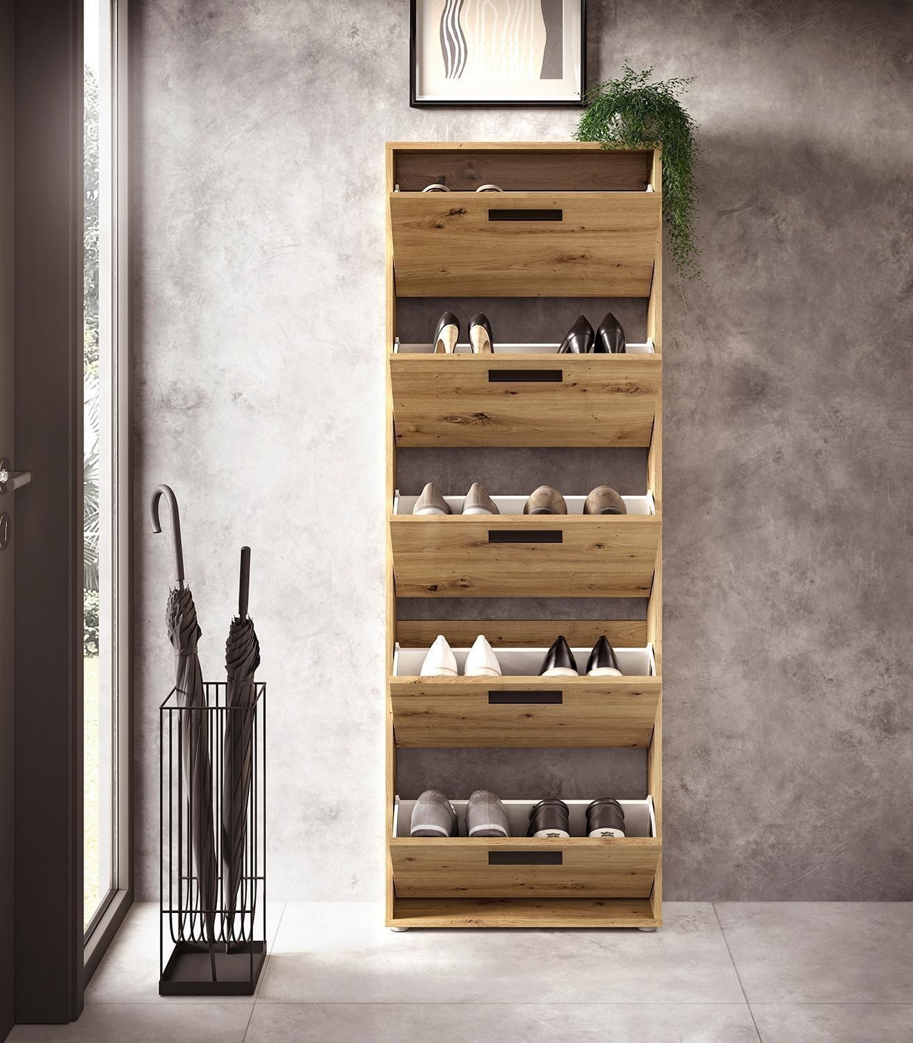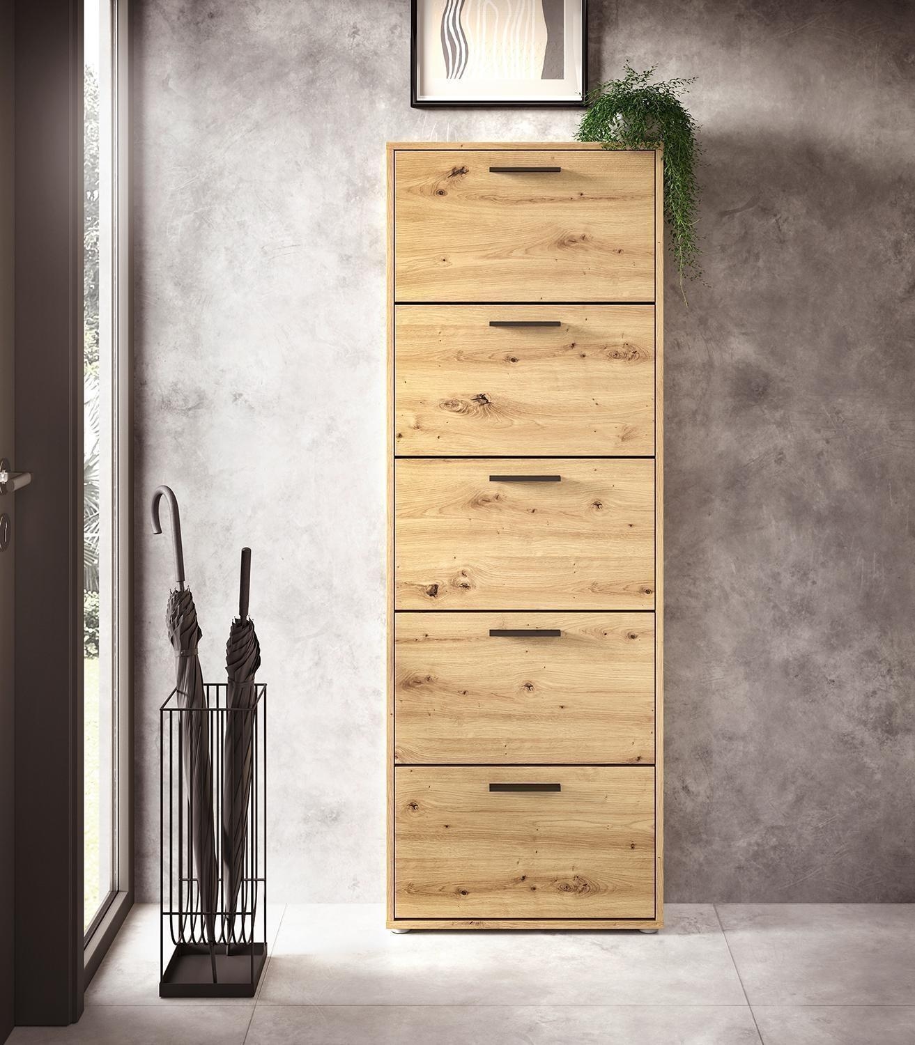 Der Schuhkipper SIRA ist ein praktisches Möbelstück zur platzsparenden Aufbewahrung von Schuhen. Er ist in Artisan Eiche Dekor gehalten und verfügt über fünf Klappen, die einzeln geöffnet werden können. Der Schuhkipper bietet Platz für bis zu 15 Paar Schuhe. Mit einer Breite von 59 cm, einer Höhe von 169 cm und einer Tiefe von 17 cm fügt er sich platzsparend in verschiedene Wohnbereiche ein.