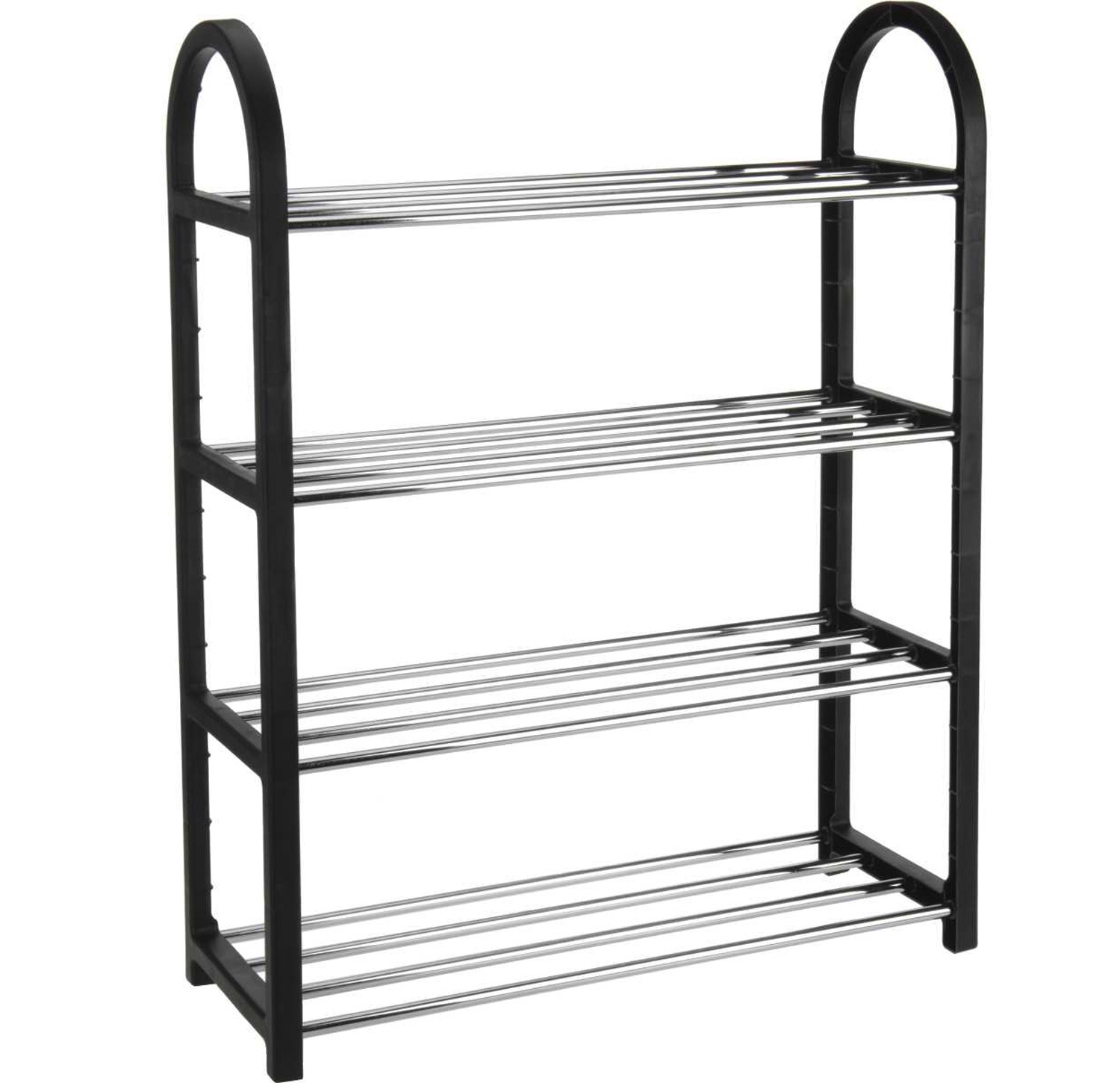 Das Schuhregal in schwarz und silbergrau bietet Platz für 12 Paar Schuhe. Die Ablageflächen aus Metall werden einfach in die Seitenteile aus Kunststoff gesteckt. So wird das Regal schnell und ganz ohne zu schrauben montiert.