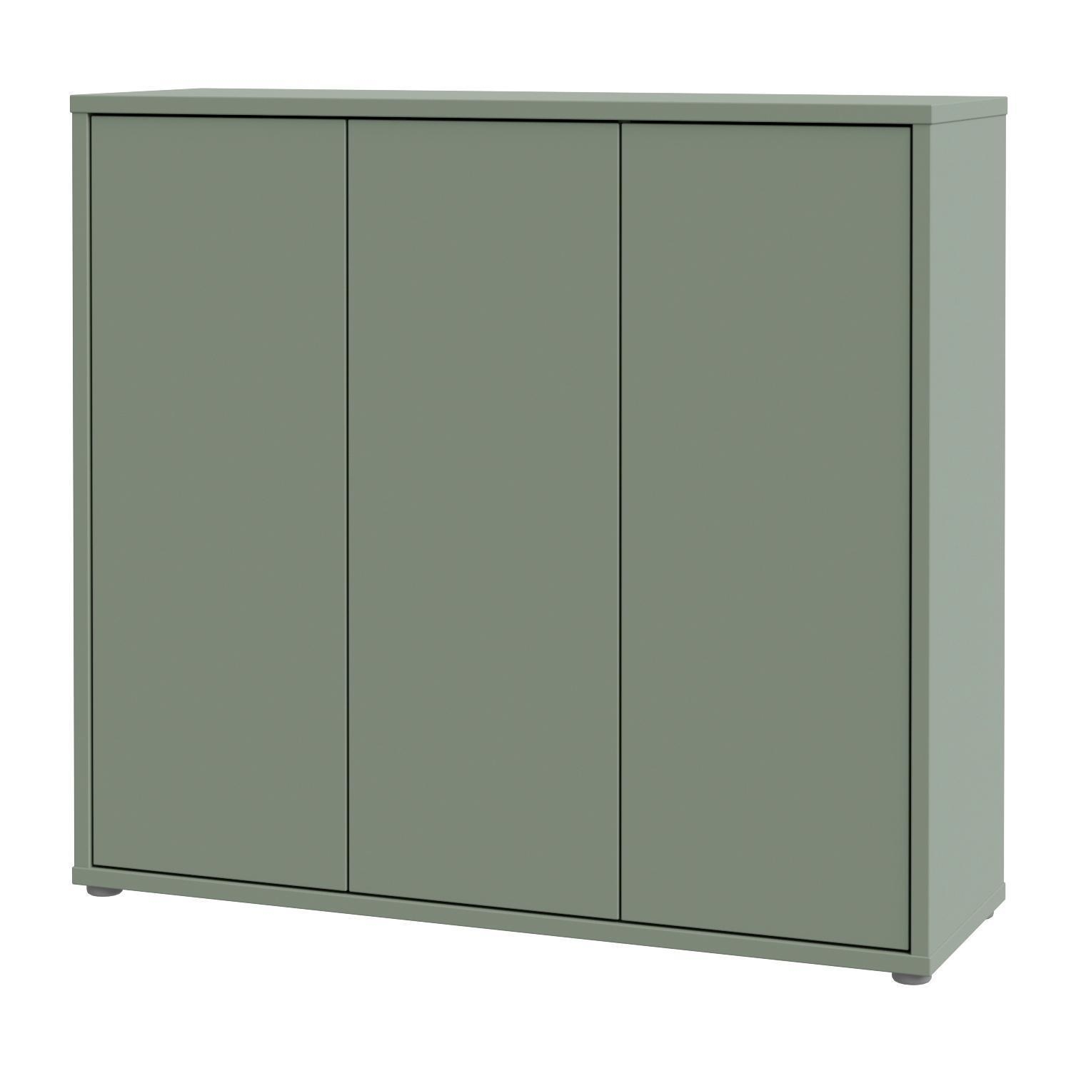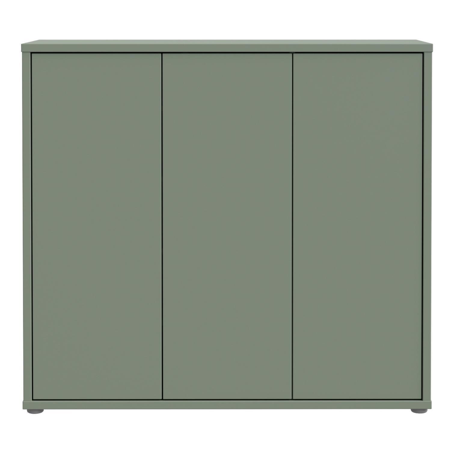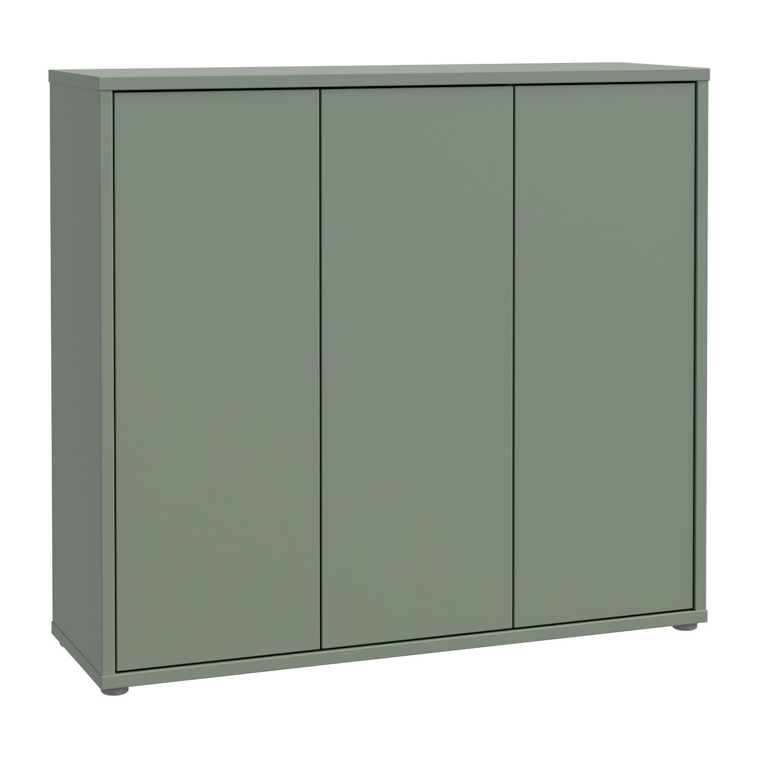 Der Schuhschrank AIDEN ist in einem ansprechenden Salbeigrün gefertigt. Er verfügt über drei Türen, die sich dank der integrierten Push-to-Open-Funktion grifflos öffnen lassen. Im Inneren befinden sich acht Einlegeböden, die eine strukturierte und platzsparende Aufbewahrung von Schuhen ermöglichen. Der Schrank hat eine Breite von 109 cm, eine Höhe von 99 cm und eine Tiefe von 35 cm.