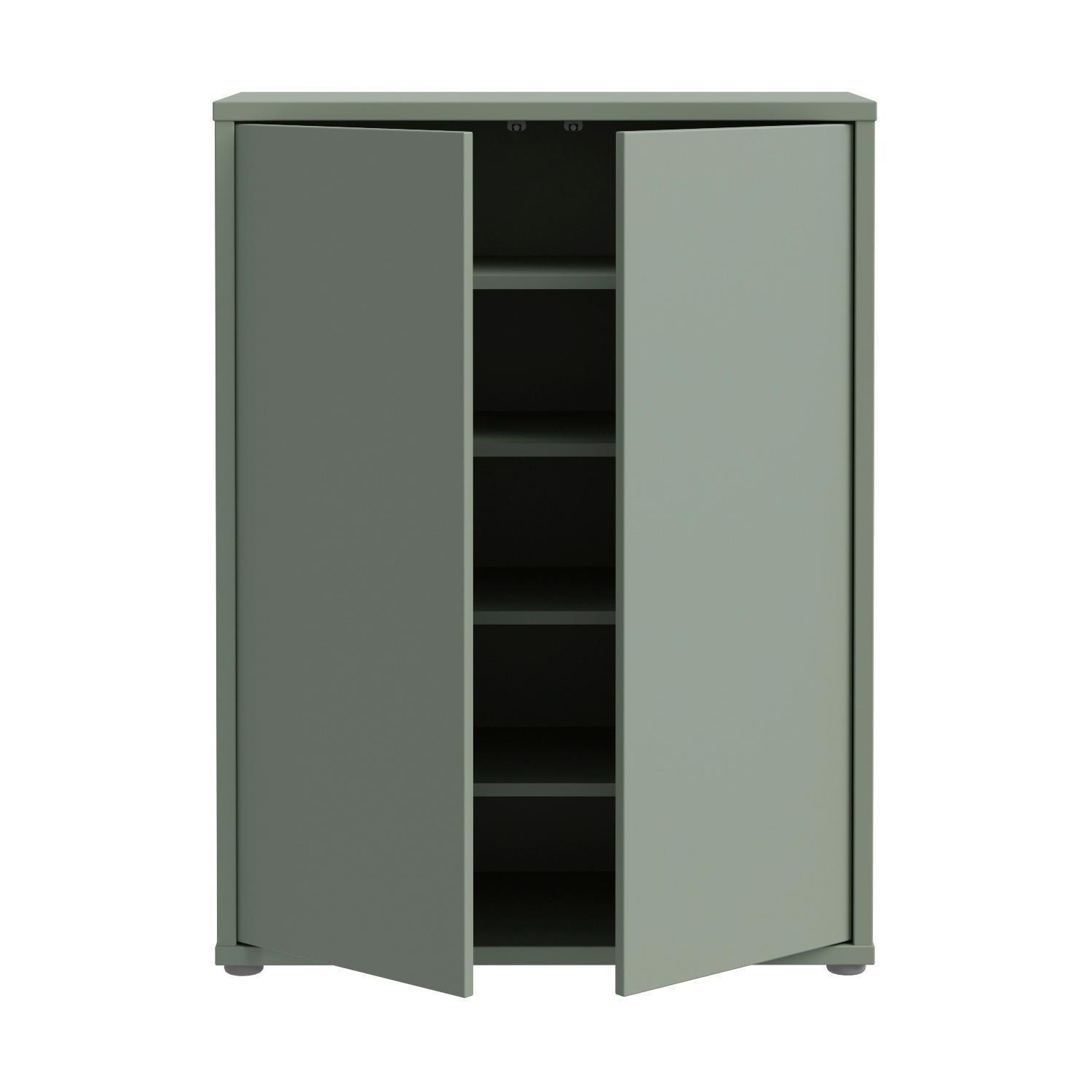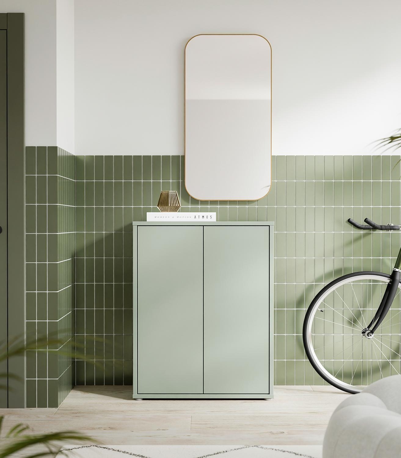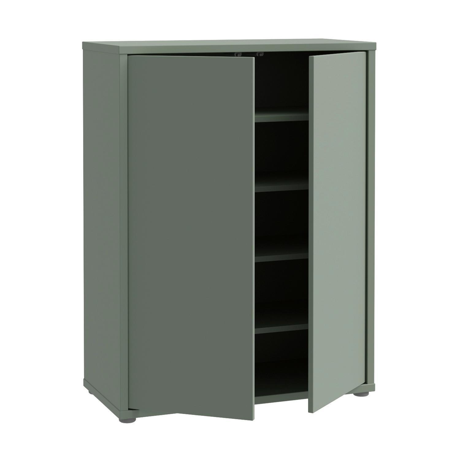 Der Schuhschrank AIDEN ist in einem ansprechenden Salbeigrün gefertigt. Er verfügt über zwei Türen, die sich dank der integrierten Push-to-Open-Funktion grifflos öffnen lassen. Im Inneren befinden sich vier Einlegeböden, die eine strukturierte und platzsparende Aufbewahrung von Schuhen ermöglichen. Der Schrank hat eine Breite von 75 cm, eine Höhe von 99 cm und eine Tiefe von 35 cm.