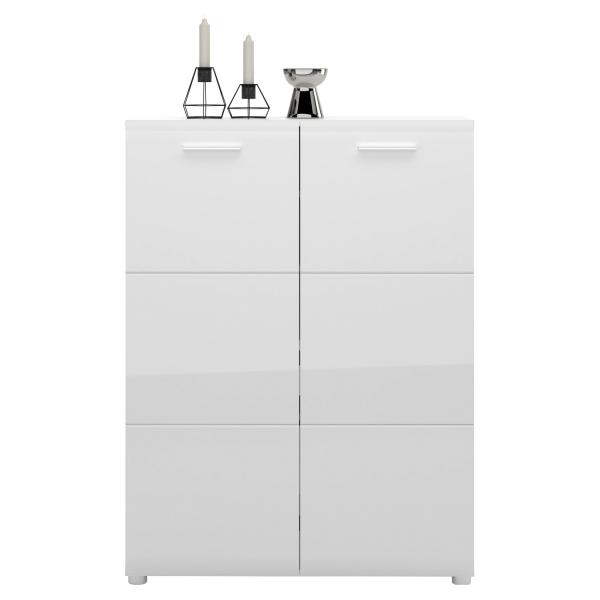Der Schuhschrank MARLIES präsentiert sich in strahlendem Weiß Hochglanz und bietet mit seinen 2 Türen und 5 dreifach höhenverstellbaren Einlegeböden eine großzügige Aufbewahrungslösung. Er fasst bis zu 24 Paar Schuhe und bringt Ordnung in Ihren Eingangsbereich oder Flur. Mit einer Breite von 90 cm, einer Höhe von 120 cm und einer Tiefe von 36 cm passt er auch in schmalere Räume. Hergestellt aus strapazierfähigem Holzwerkstoff, verspricht er Stabilität und Langlebigkeit.