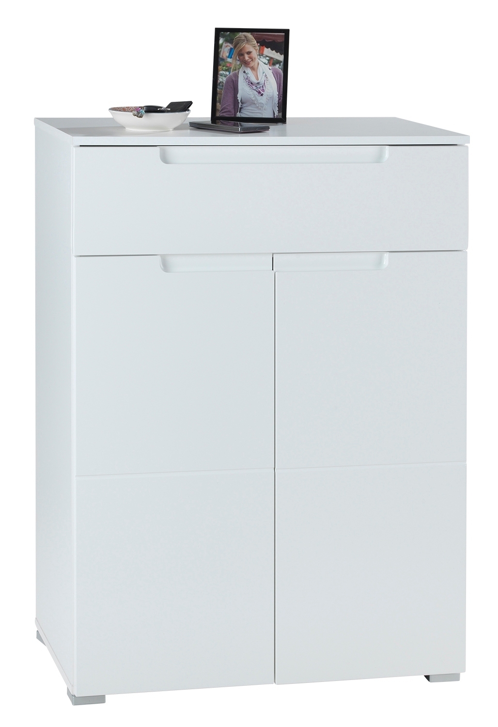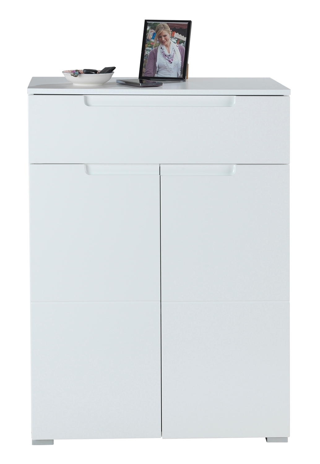 Der Schuhschranks umfasst 2 Türen, 1 dreifach höhenverstellbarer Einlegeboden und eine Schublade. In zeitlosem Weiß gehalten, präsentiert sich der Schrank mit einer Breite von 70 cm, einer Höhe von 101 cm und einer Tiefe von 40 cm. Hergestellt aus Holzwerkstoff, besticht das Möbelstück durch eine ansprechende Kombination aus Weiß Hochglanz an der Front und mattem Weiß am Korpus. Ein stilvolles und funktionales Element für die ordentliche Aufbewahrung von Schuhen und Accessoires, das sich harmonisch in verschiedenste Einrichtungsstile einfügt.