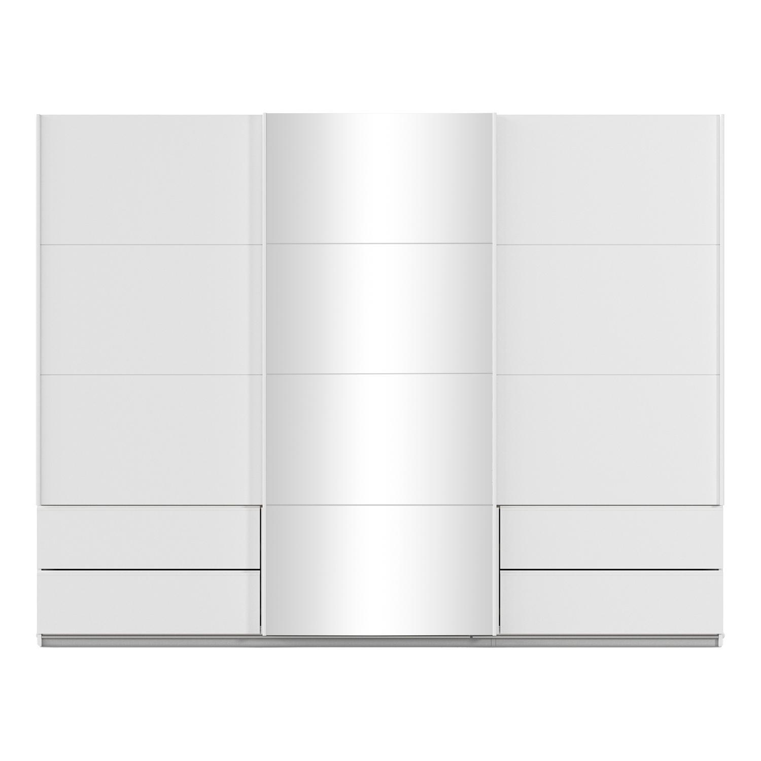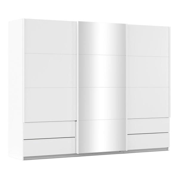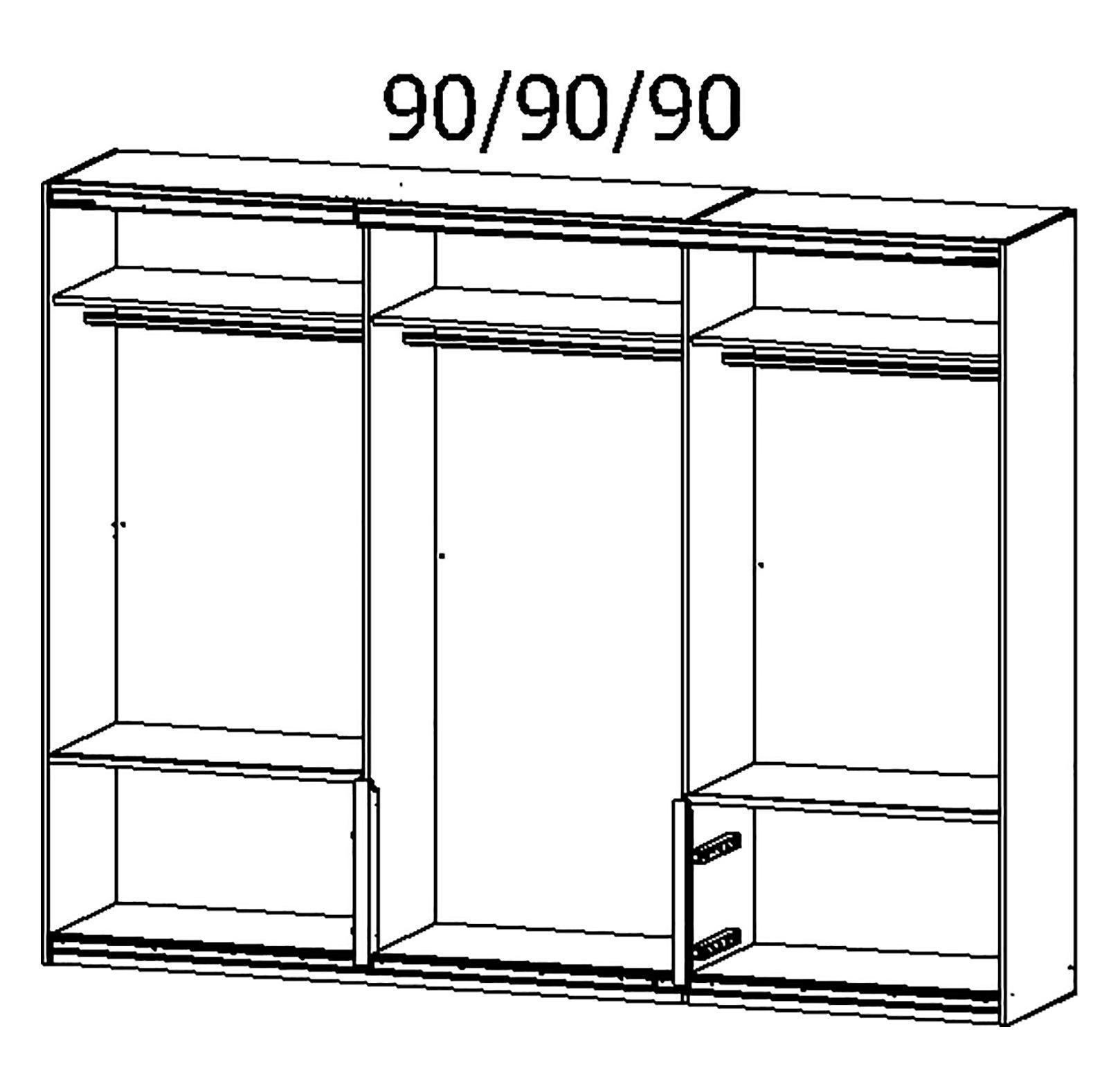 | Lieferumfang: | 1 Schwebetürenschrank mit 1 Spiegeltür, 2 Türen, 4 Schubladen, 3 Kleiderstangen und 3 Einlegeböden |