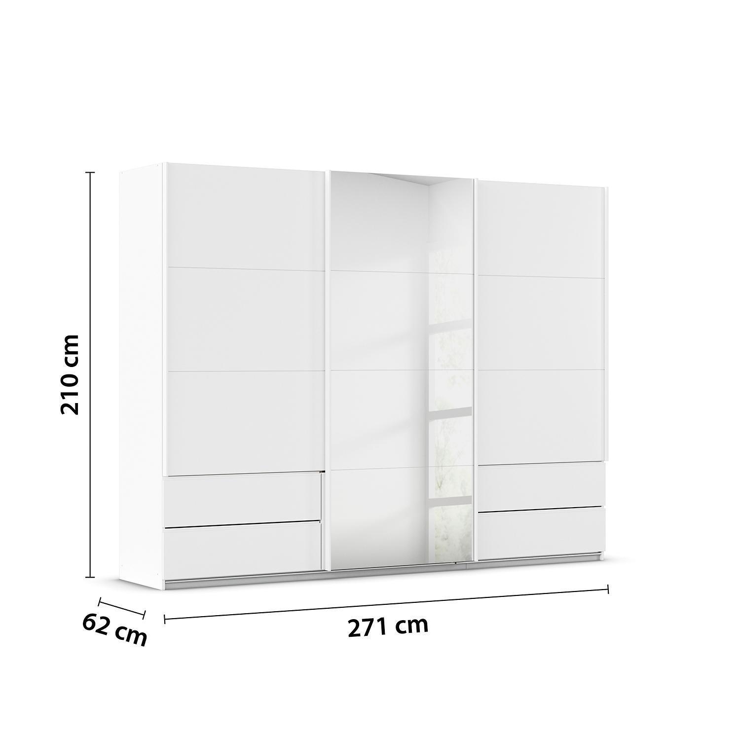 Der Schwebetürenschrank ELLI überzeugt durch seine funktionale Ausstattung und großzügige Stauraumkapazität. Das Modell ist in der Farbe Alpinweiß gehalten und verfügt über drei Türen, davon eine mit Spiegel, sowie über vier integrierte Schubladen. Im Innenraum befinden sich drei Kleiderstangen und drei Einlegeböden, die eine vielseitige und strukturierte Aufbewahrung ermöglichen. Mit einer Breite von 271 cm, einer Höhe von 210 cm und einer Tiefe von 62 cm bietet der Schrank reichlich Platz für Kleidung und weitere Textilien. Der Schwebetürenschrank ist Made in Germany.