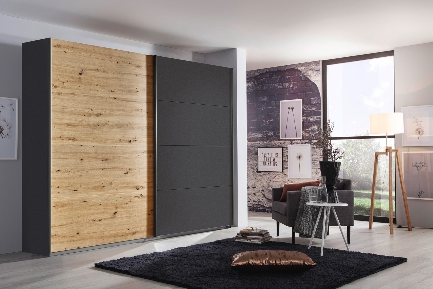 Bei diesem Kleiderschrank können Sie die grauen und holzfarbenen Elemente individuell kombinieren, 2 Beispiele sehen Sie in den Fotos.