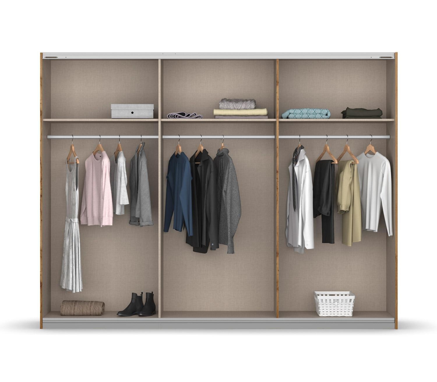 Dieser Kleiderschrank hat im Inneren die Farbe grau. Zu einigen Kleiderschränken bieten wir Zubehör wie Schubkästeneinsätze, Wäscheeinteilungen, zusätzliche Fachböden und Türdämpfer an.