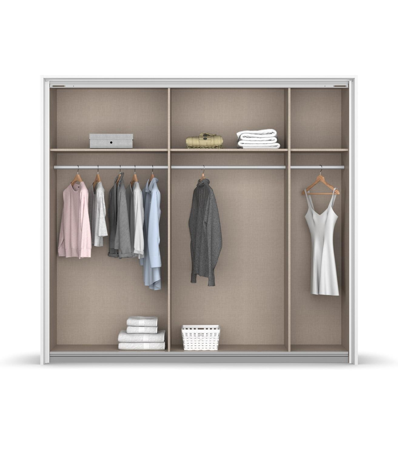 Dieser Kleiderschrank hat im Inneren die Farbe grau. Zu einigen Kleiderschränken bieten wir Zubehör wie Schubkästeneinsätze, Wäscheeinteilungen, zusätzliche Fachböden und Türdämpfer an.