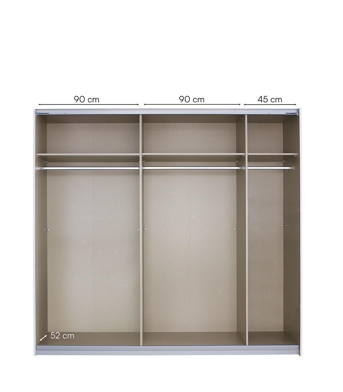 | Lieferumfang: | 1 Schwebetürenschrank mit 2 Türen, 3 Einlegeböden und 3 Kleiderstangen |