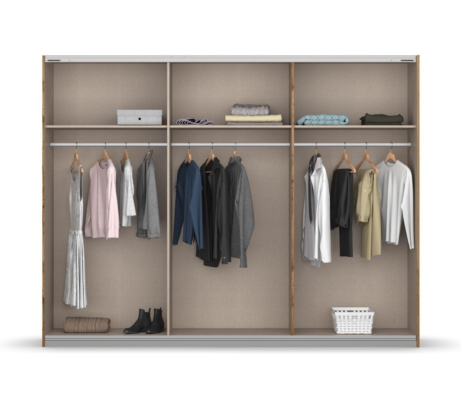 Dieser Kleiderschrank hat im Inneren die Farbe Braun. Zu einigen Kleiderschränken bieten wir Zubehör wie Schubkästeneinsätze, Wäscheeinteilungen, zusätzliche Fachböden und Türdämpfer an.
