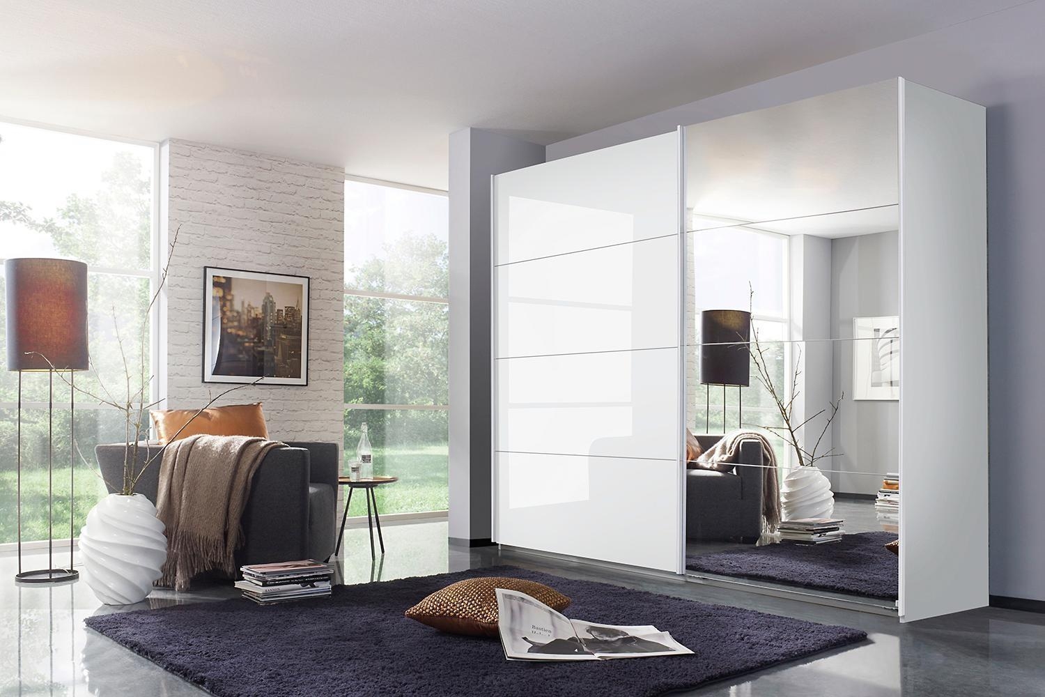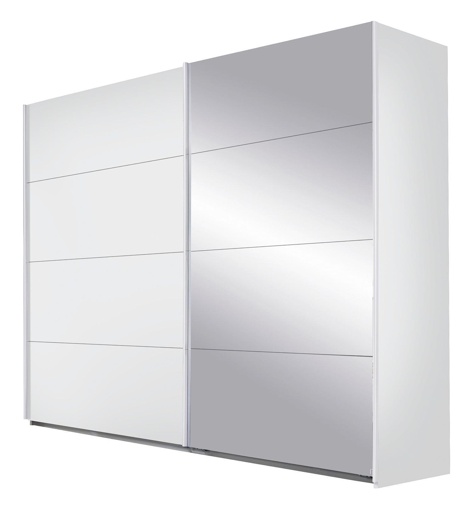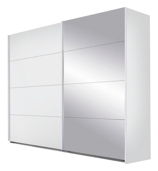 Der Schwebetürenschrank JAMIE ist in Alpinweiß ausgeführt und verfügt über eine Teilfront in Weiß Hochglanz. Er ist mit einer Schwebetür und einer Spiegeltür ausgestattet. Im Innenbereich befinden sich drei Kleiderstangen und drei Einlegeböden. Der Schrank wird in Deutschland gefertigt. Die Abmessungen betragen 271 cm in der Breite, 210 cm in der Höhe und 62 cm in der Tiefe.