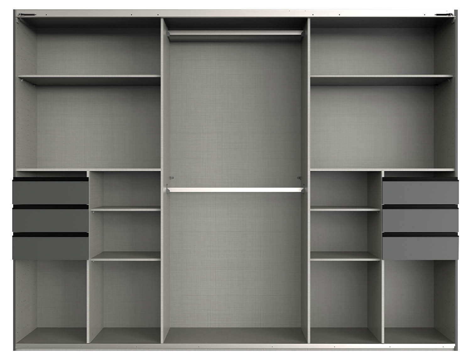 Dieser Kleiderschrank hat im Inneren ein Dekor in Leinenoptik in der Farbe grau. Zu einigen Kleiderschränken bieten wir Zubehör wie Schubkästeneinsätze, Wäscheeinteilungen, zusätzliche Fachböden und Türdämpfer an.