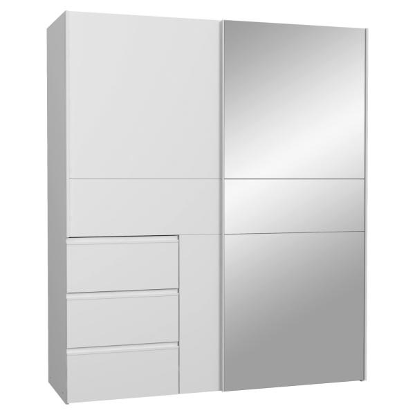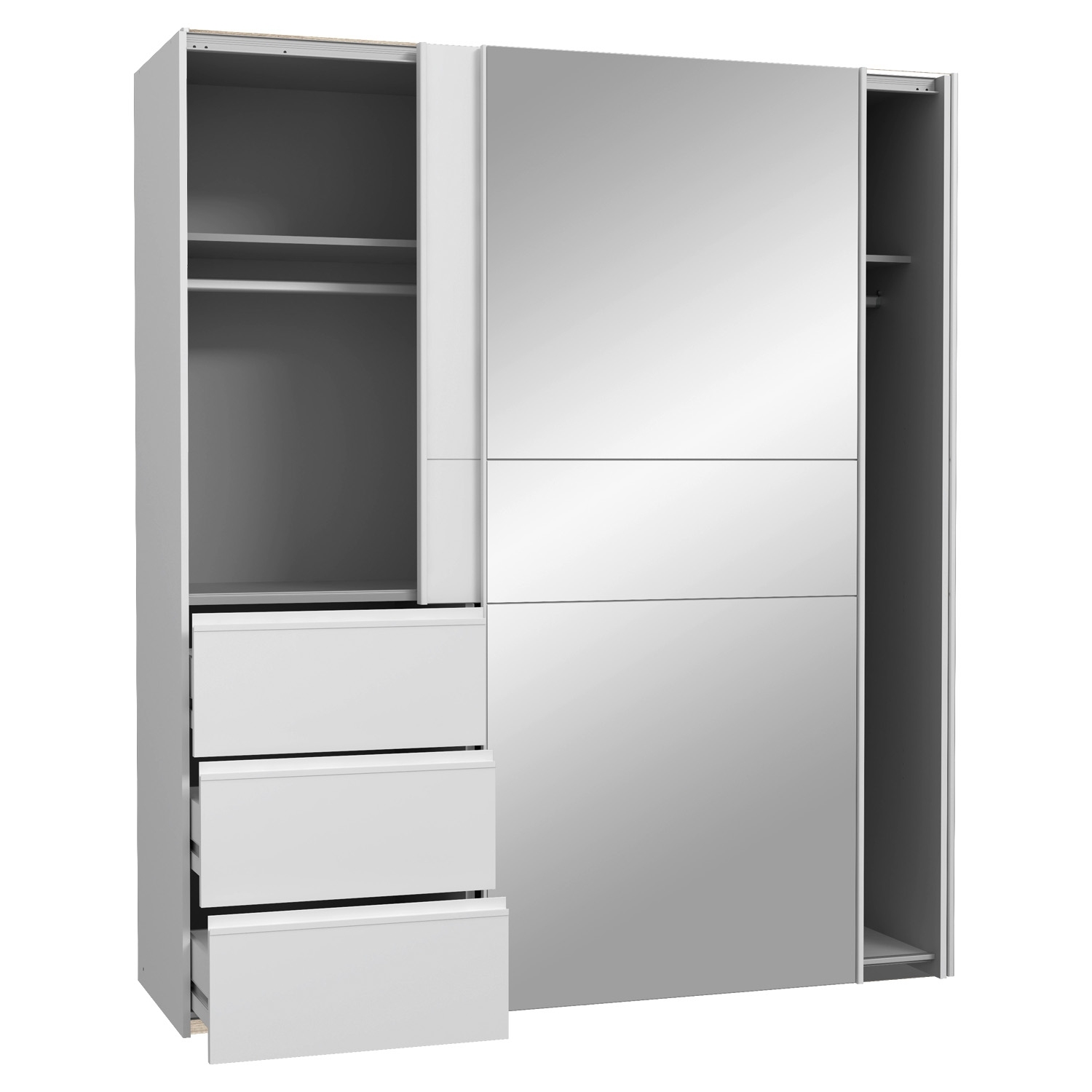 | Lieferumfang: | 1 Schwebetürenschrank mit 2 Türen und Spiegelteilfront, 3 Schubladen, 2 Kleiderstangen und 2 Einlegeböden |