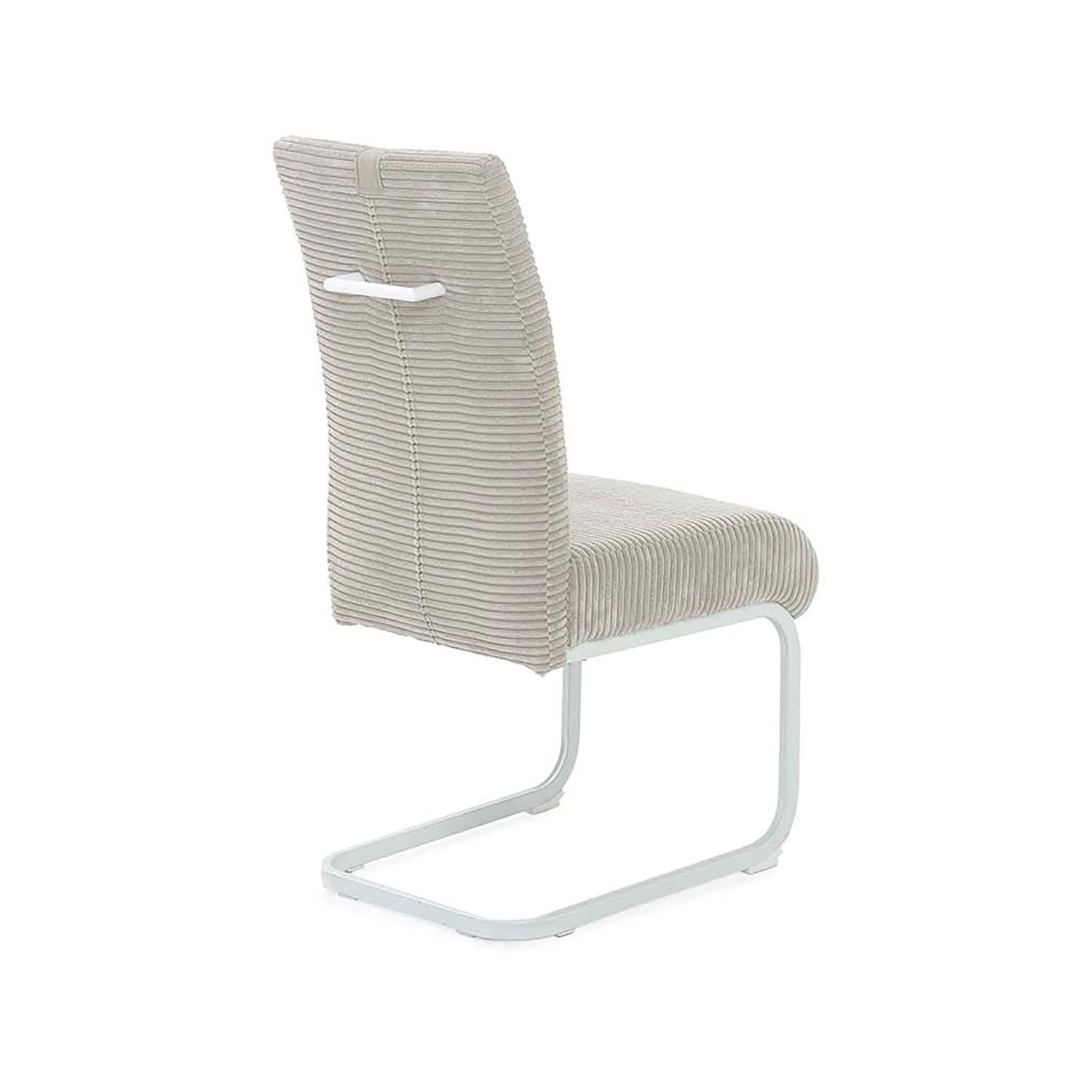 Der Schwingstuhl KRISTIN hat einen Bezug aus Cord in Beige und ein Metallgestell in Perlweiß. Die Sitzfläche ist mit einer Tonnentaschenfederkernpolsterung ausgestattet. Ein Griff an der Rückenlehne erleichtert das Handling. Der Stuhl ist bis maximal 110 kg belastbar. Die Maße betragen 44 cm in der Breite, 98 cm in der Höhe und 60 cm in der Tiefe.