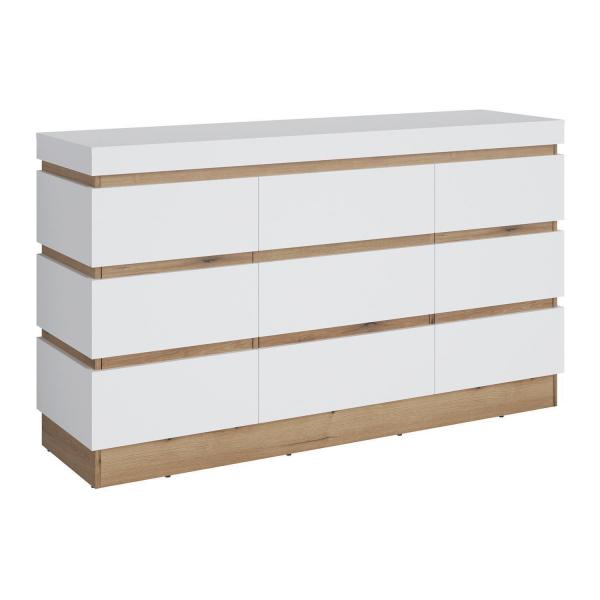Das Sideboard CLARA ist in Alpinweiß gehalten und mit Absetzungen in Evoke Eiche Dekor versehen. Es verfügt über drei Türen und eine Schublade. Im Inneren befinden sich fünf Einlegeböden. Die Maße des Sideboards betragen 161 cm in der Breite, 93 cm in der Höhe und 45 cm in der Tiefe.