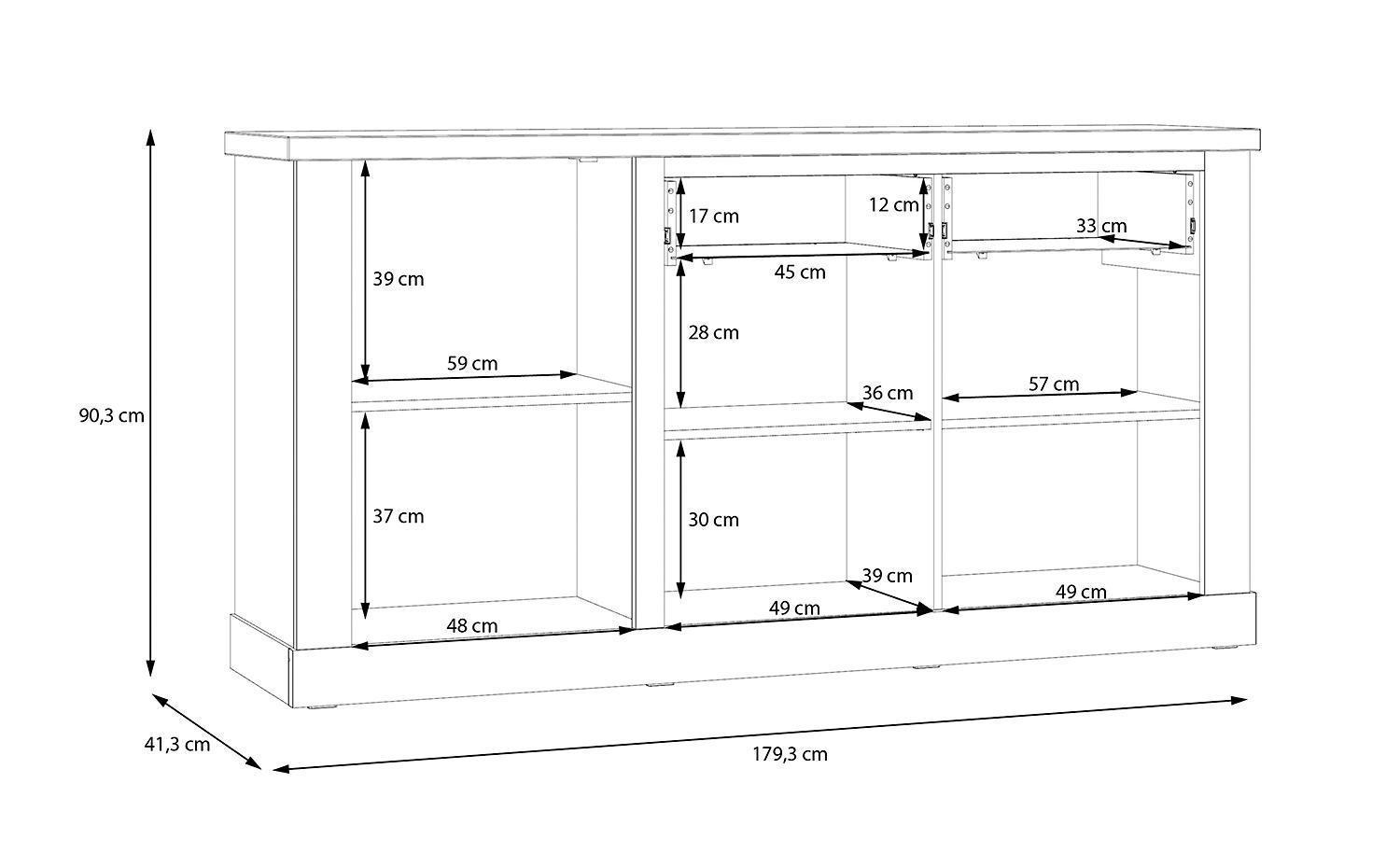 | Lieferumfang: | 1 Sideboard mit 3 Türen, 2 Schubladen und 3 Einlegeböden. Eine Beleuchtung ist nicht enthalten |