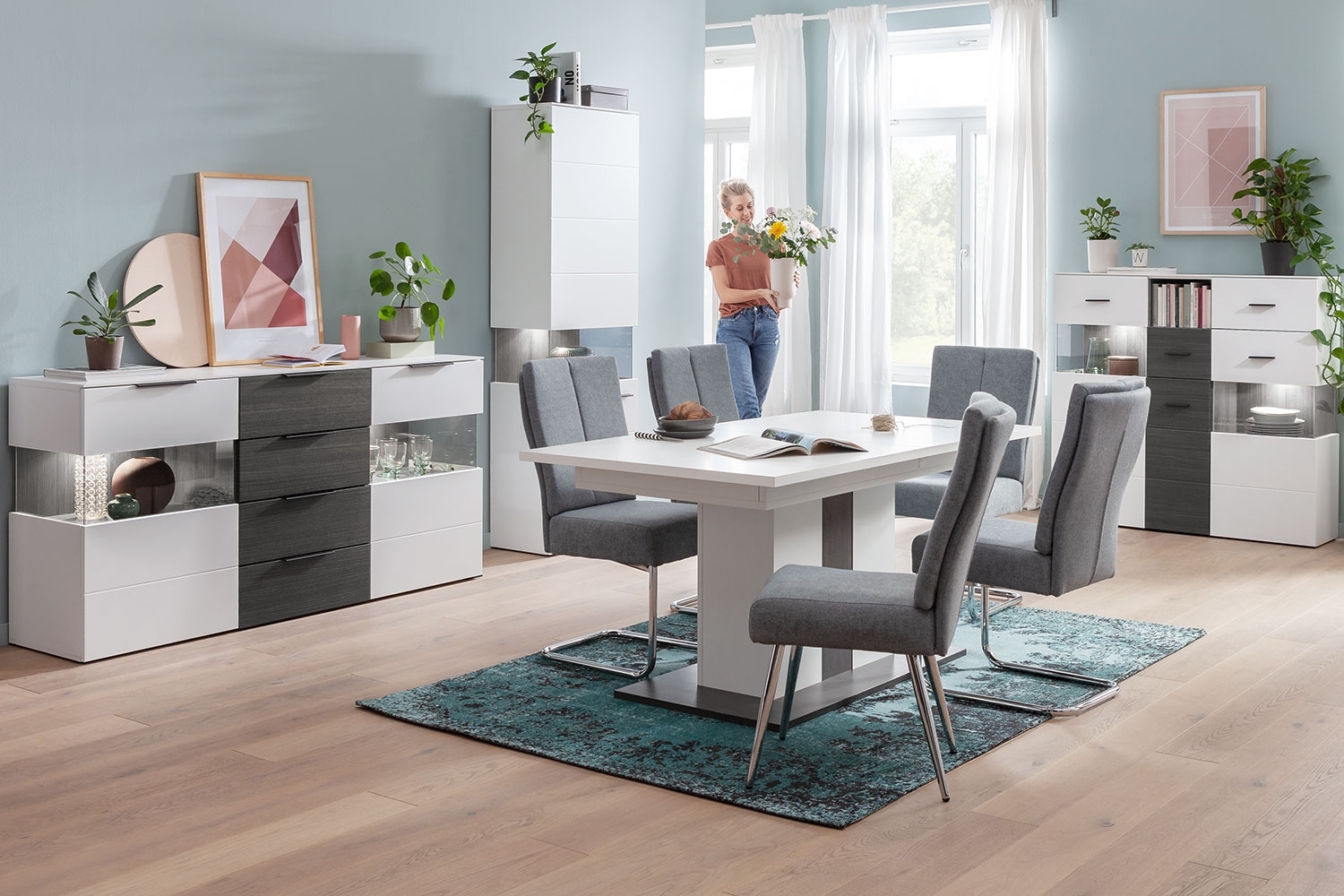 Die Türen des Sideboards sind mit einer Soft-Close-Funktion ausgestattet, die ein lautes oder unkontrolliertes Zufallen verhindert. Die Schubladen haben ebenfalls eine Soft-Close-Funktion und einen zusätzlichen Selbsteinzug, wodurch sie sich ab einem gewissen Punkt beim Schließen von alleine wieder einziehen.