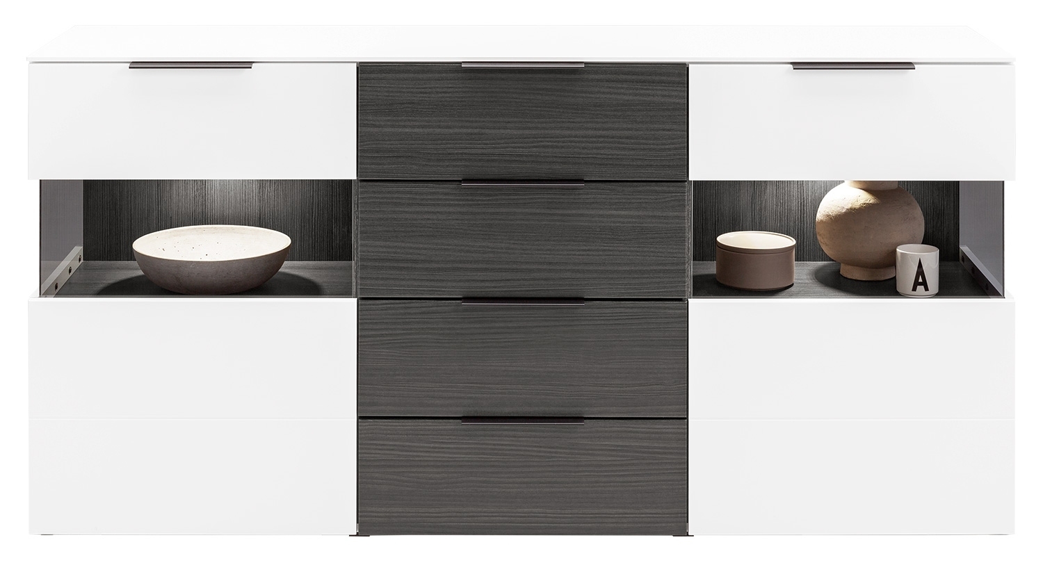 Weiß supermatt - Touchwood Dekor - B 180 cm - 2 Türen - 4 Schubladen - mit LED-Beleuchtung