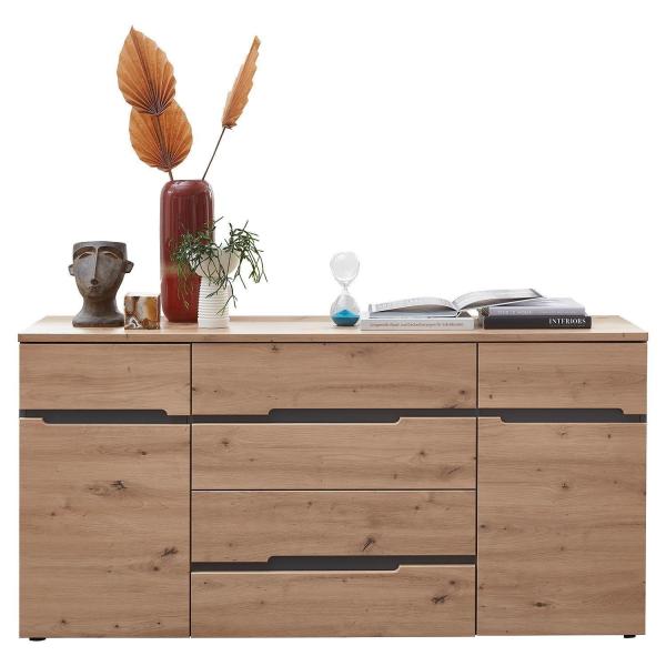 Das Sideboard MIRENO ist in Artisan Eiche Dekor gefertigt und wird durch Absetzungen in Graphitgrau ergänzt. Es verfügt über zwei Türen und drei Schubladen, die mit insgesamt vier Einlegeböden im Inneren zusätzlichen Stauraum bieten. Die Maße des Sideboards betragen 165 cm in der Breite, 82 cm in der Höhe und 44 cm in der Tiefe.