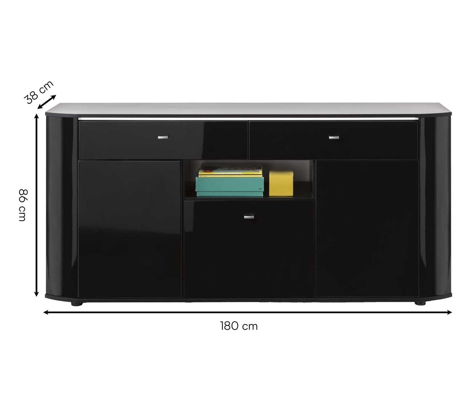 Schwarz Hochglanz - Schwarz matt - B 180 cm - 3 Türen - 2 Schubladen