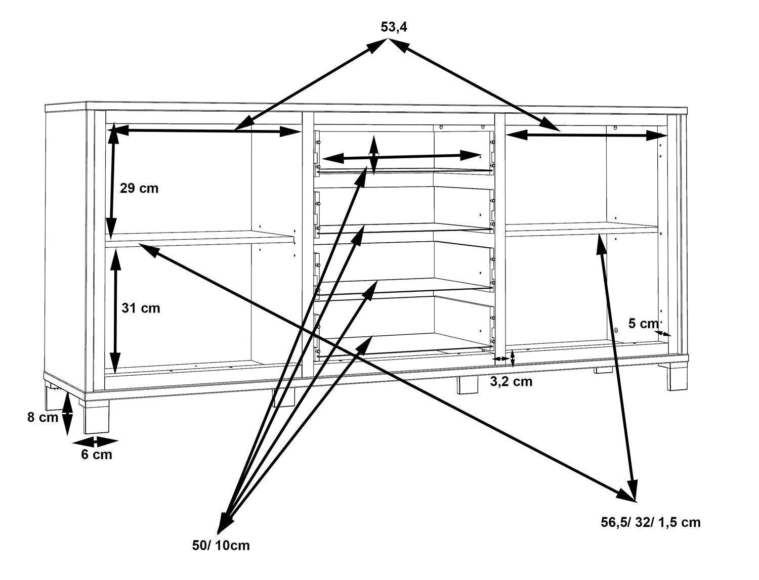 | Lieferumfang: | 1 Sideboard mit 2 Türen, 4 Schubladen und 2 Einlegeböden |
