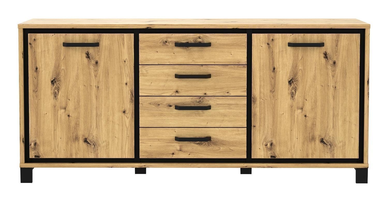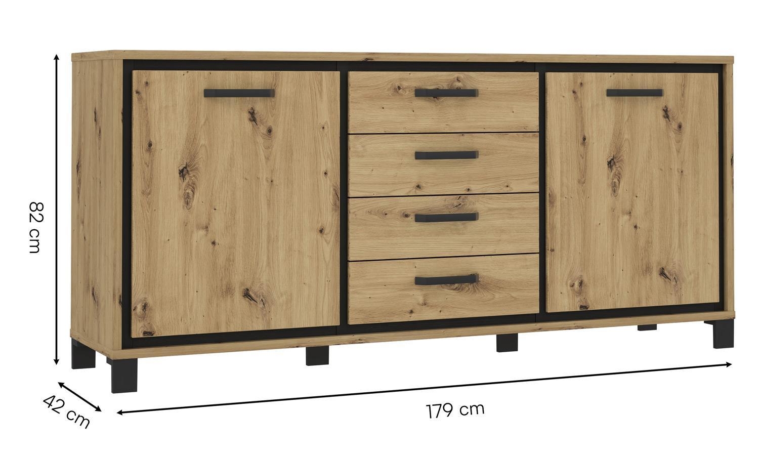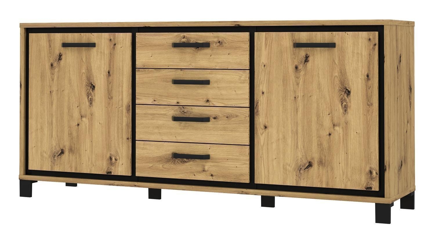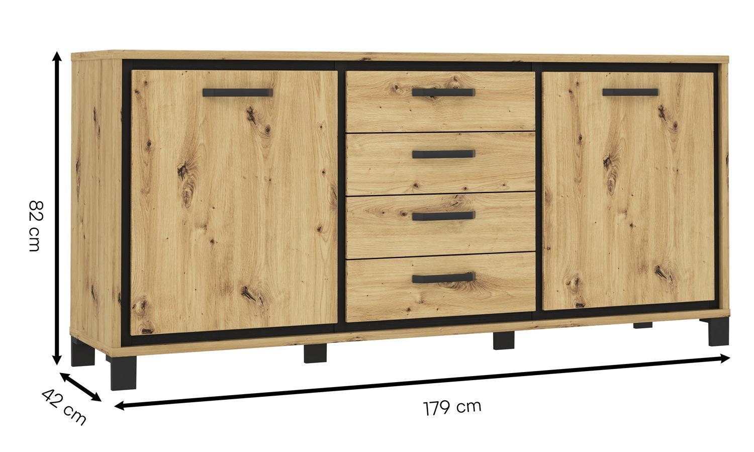Artisan Eiche Dekor - B 179 cm - Absetzungen in Schwarz - 2 Türen - 4 Schubladen