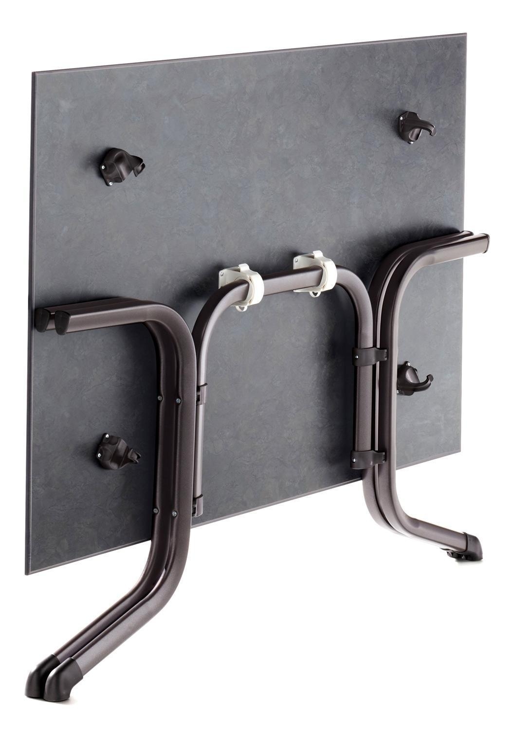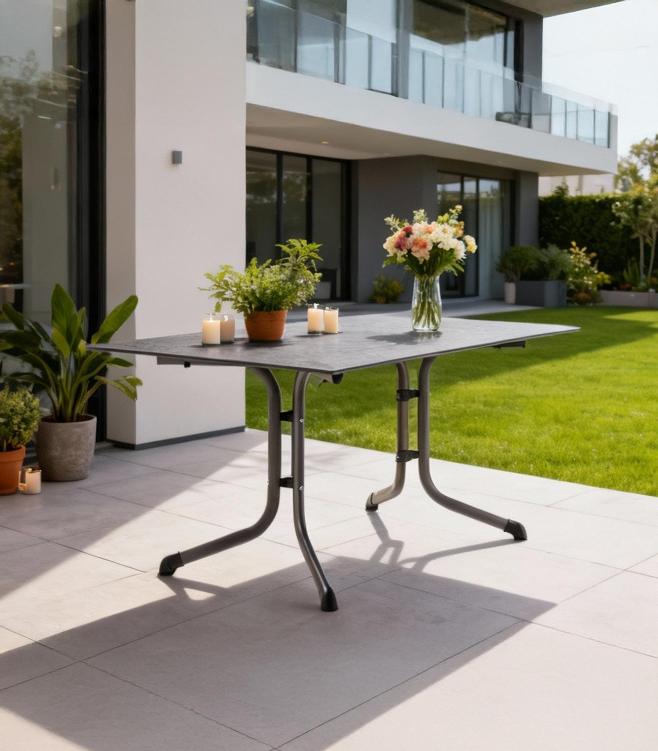 Die Tischplatte des Gartentisches besteht aus Polytec. Einem Material, das aus unter Hochdruck verpresstem Laminat (HPL) entsteht und sehr witterungsresistent ist. Außerdem ist die Tischplatte wetterfest, schlagfest, glutfest, kratzfest, bruchfest und säurebeständig. Des Weiteren ist die Tischplatte kältefest, wodurch der Tisch auch in kälteren Monaten und sogar bei Schnee im Freien stehen kann.
