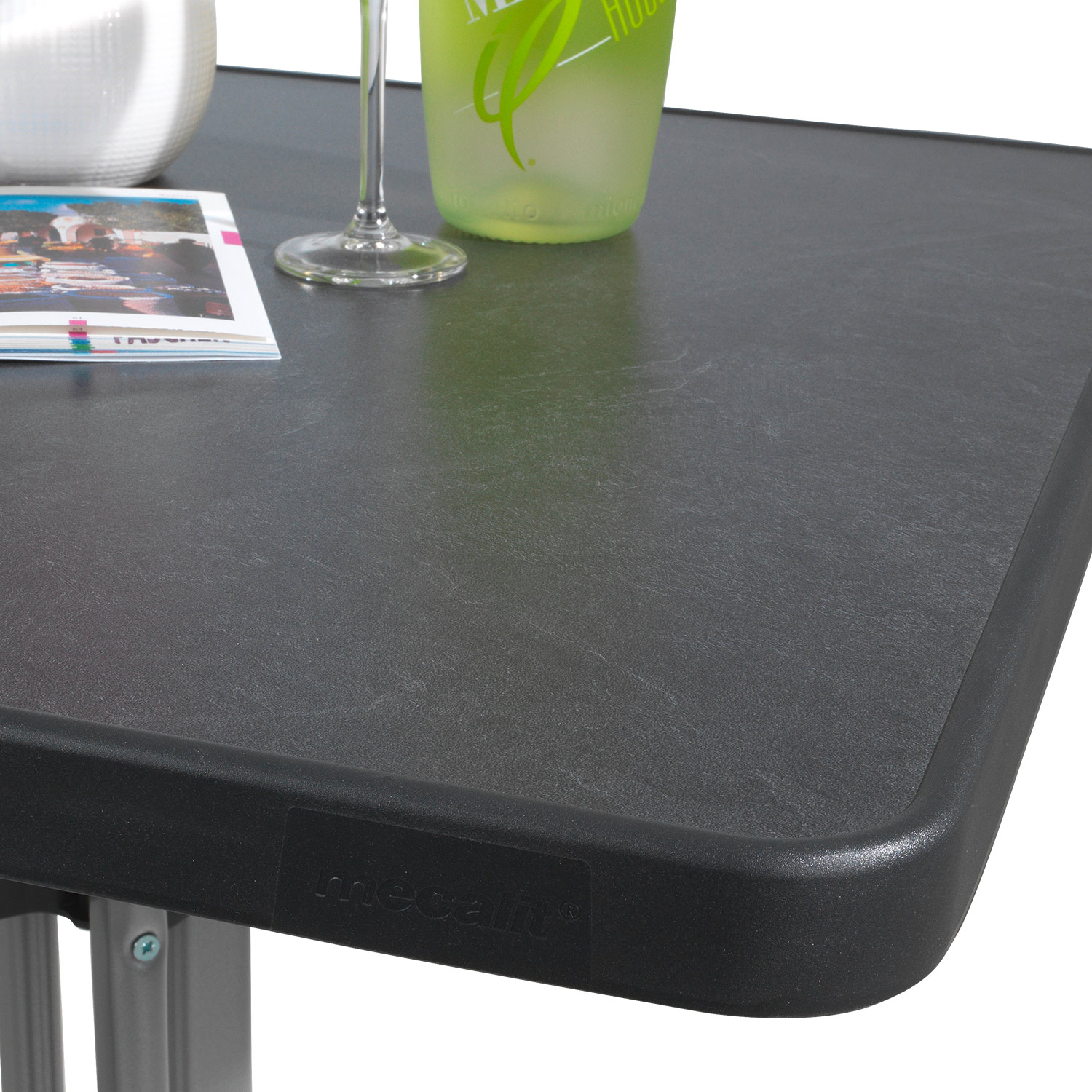 Die Tischplatte des Gartentisches besteht aus Mecalit. Einem Material, dass aus mehreren hochverdichteten Pressspanplatten in Verbindung mit einem Kunststoffmaterial entsteht. Dadurch wird die Tischplatte wetterfest, schlagfest, glutfest und säurebeständig. Außerdem ist die Tischplatte kältefest, wodurch der Tisch auch in kälteren Monaten und sogar bei Schnee im Freien stehen kann.