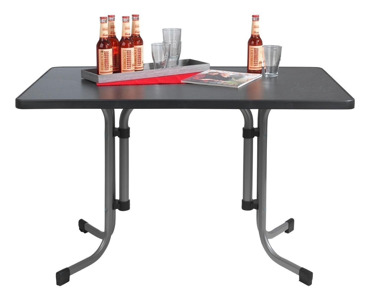 Die Tischplatte des Gartentisches besteht aus Mecalit. Einem Material, dass aus mehreren hochverdichteten Pressspanplatten in Verbindung mit einem Kunststoffmaterial entsteht. Dadurch wird die Tischplatte wetterfest, schlagfest, glutfest und säurebeständig. Außerdem ist die Tischplatte kältefest, wodurch der Tisch auch in kälteren Monaten und sogar bei Schnee im Freien stehen kann.