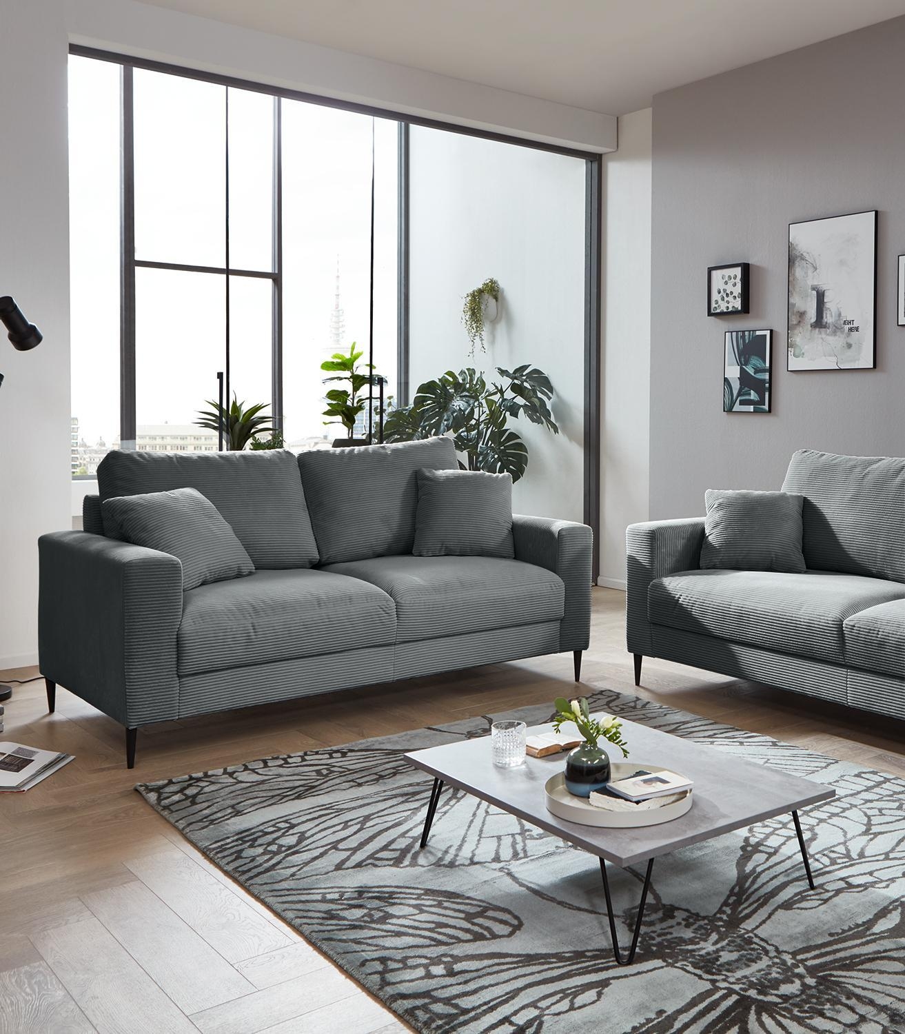 Das Sofa 2-Sitzer BIRGA ist mit einem Cordbezug in Grau ausgestattet und steht auf Metallfüßen in Schwarz. Die Sitzfläche verfügt über Schaumstoff auf Nosagunterfederung und sorgt damit für gemütliches Verweilen. Im Lieferumfang enthalten sind zwei Rückenkissen sowie zwei Zierkissen. Die Maße betragen 172 cm in der Breite, 84 cm in der Höhe und 94 cm in der Tiefe. Die Sitzhöhe liegt bei 45 cm, während die Sitztiefe 58 cm beträgt.