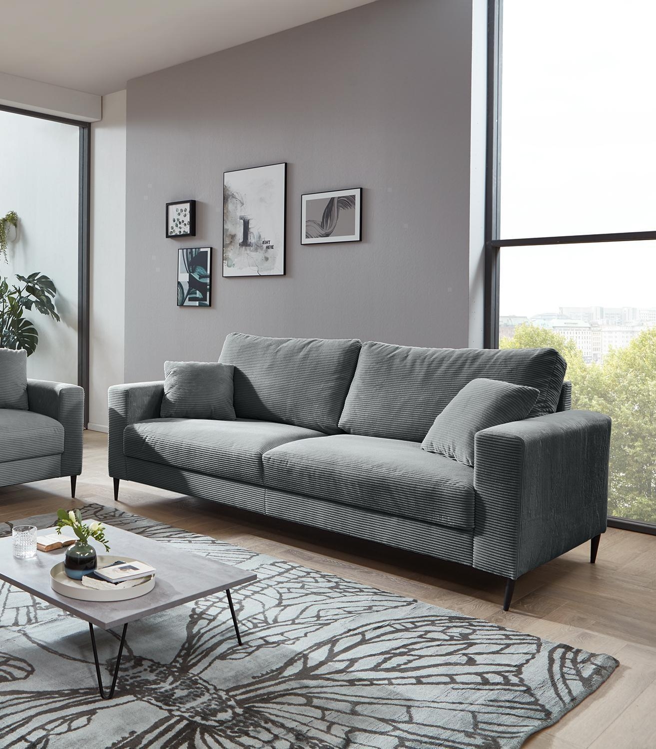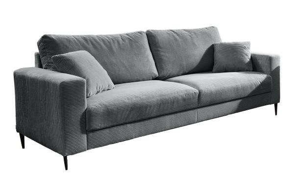 Das Sofa 3-Sitzer BIRGA ist mit einem Cordbezug in Grau ausgestattet und steht auf Metallfüßen in Schwarz. Die Sitzfläche verfügt über Schaumstoff auf Nosagunterfederung und sorgt damit für gemütliches Verweilen. Im Lieferumfang enthalten sind zwei Rückenkissen sowie zwei Zierkissen. Die Maße betragen 214 cm in der Breite, 84 cm in der Höhe und 94 cm in der Tiefe. Die Sitzhöhe liegt bei 45 cm, während die Sitztiefe 58 cm beträgt.