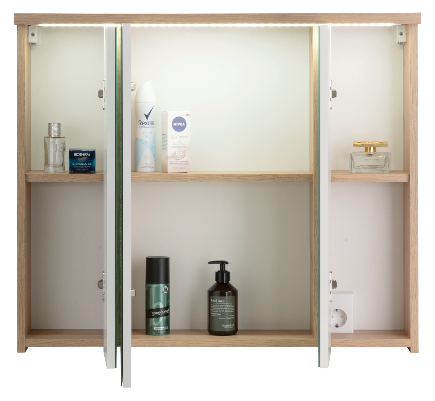 Der Spiegelschrank mit LED-Beleuchtung ist mit 3 Türen ausgestattet. Eine Steckdose und der Lichtschalter befinden sich auf der davorstehend rechten Seite im Inneren des Schranks. Hinter jeder Tür gibt es einen 3-fach höhenverstellbaren Einlegeboden. Dies ermöglicht eine optimale Anpassung an die jeweiligen Bedürfnisse.