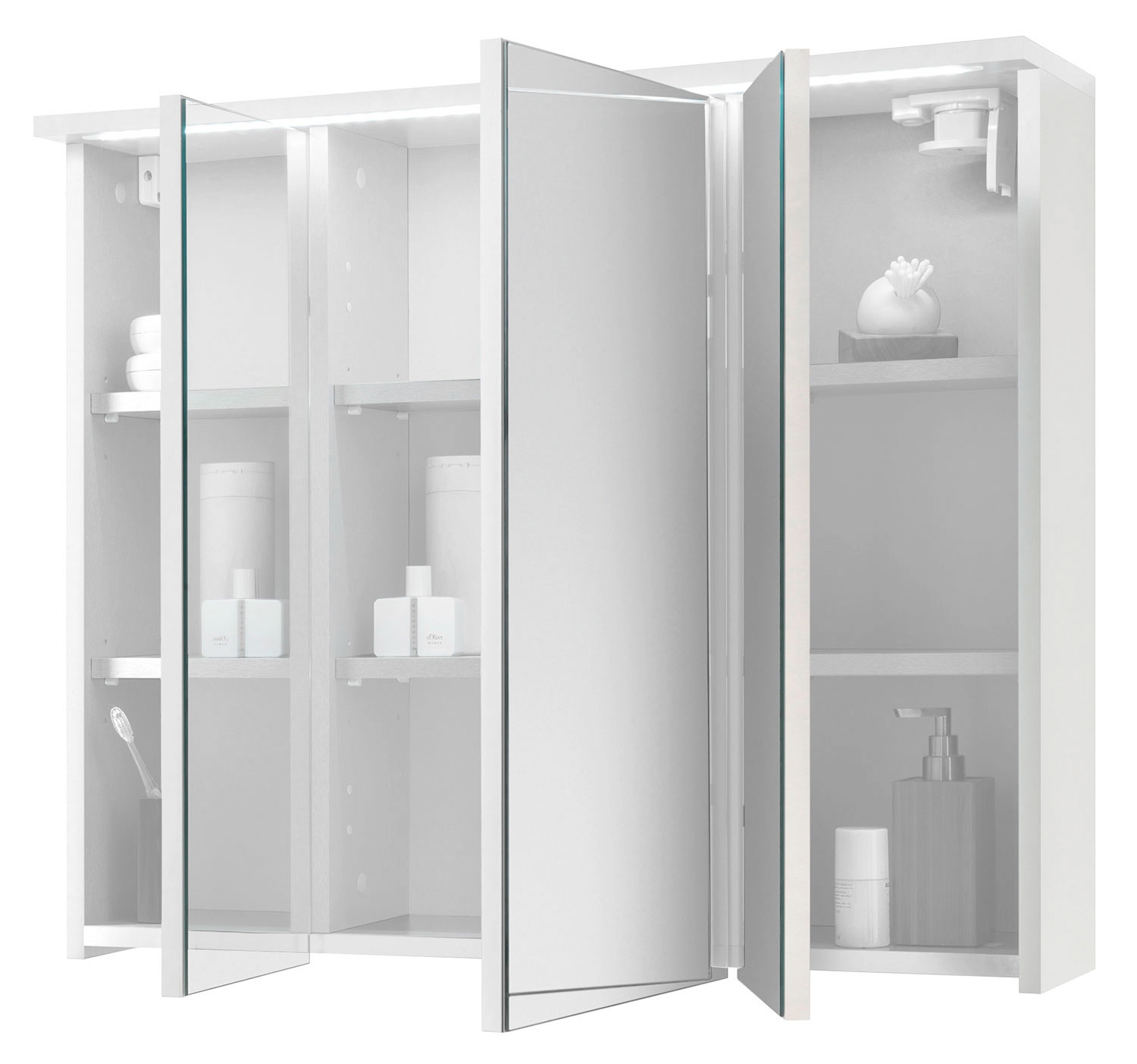 Der Spiegelschrank mit LED-Beleuchtung ist mit 3 Türen ausgestattet. Eine Steckdose und der Lichtschalter befinden sich auf der davorstehend rechten Seite im Inneren des Schranks. Hinter jeder Tür gibt es zwei 3-fach höhenverstellbare Einlegeböden. Dies ermöglicht eine optimale Anpassung an die jeweiligen Bedürfnisse.