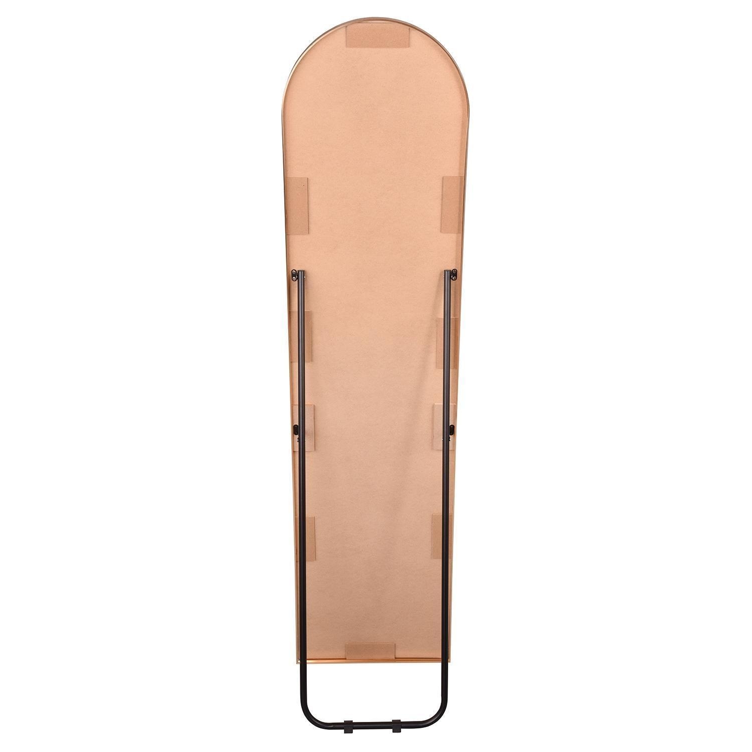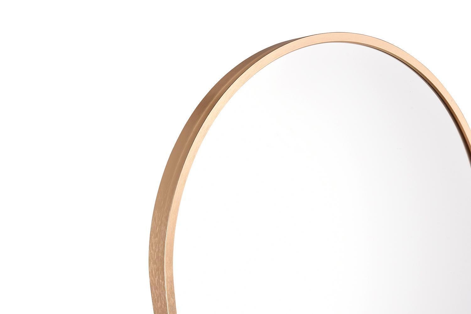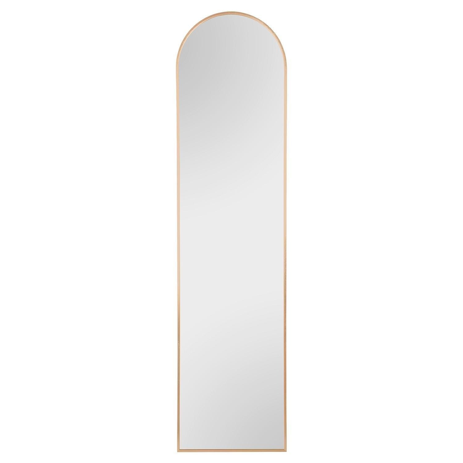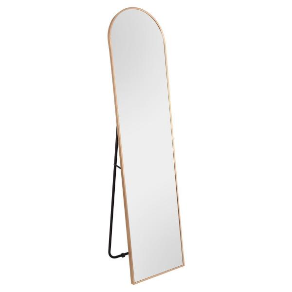 Der Standspiegel BERENAS verfügt über einen goldgelben Metallrahmen und eine Spiegelfläche aus Spezialglas. Dank des U-förmigen Bügels steht der Spiegel eigenständig und benötigt keine zusätzliche Befestigung. Die abgerundete Oberseite verleiht dem Rahmen eine klare Formgebung. Die Maße betragen 40 cm in der Breite und 160 cm in der Höhe.