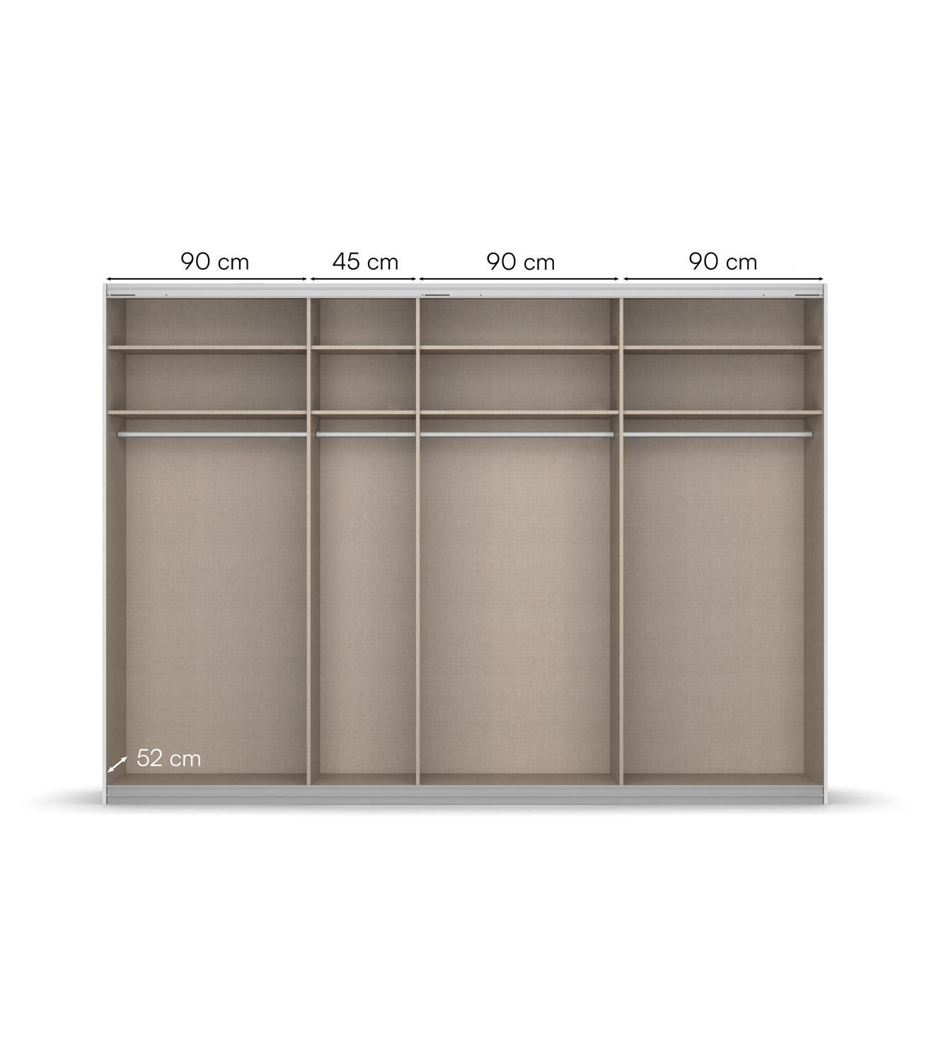 | Lieferumfang: | 1 Synchron-Schwebetürenschrank mit 2 Türen und 2 Synchrontüren, 8 Einlegeböden und 4 Kleiderstangen. Passepartout optional erhältlich |