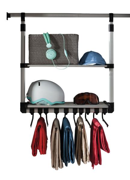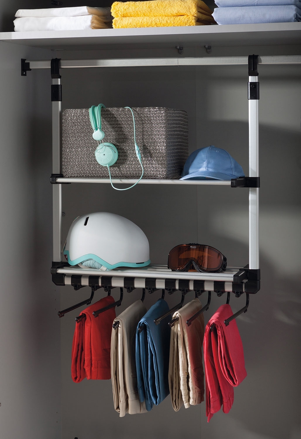 | Lieferumfang: | 1 höhenverstellbares Teleskop-Einhängesystem mit 2 Ablageflächen und 10 Hosenhaltern |