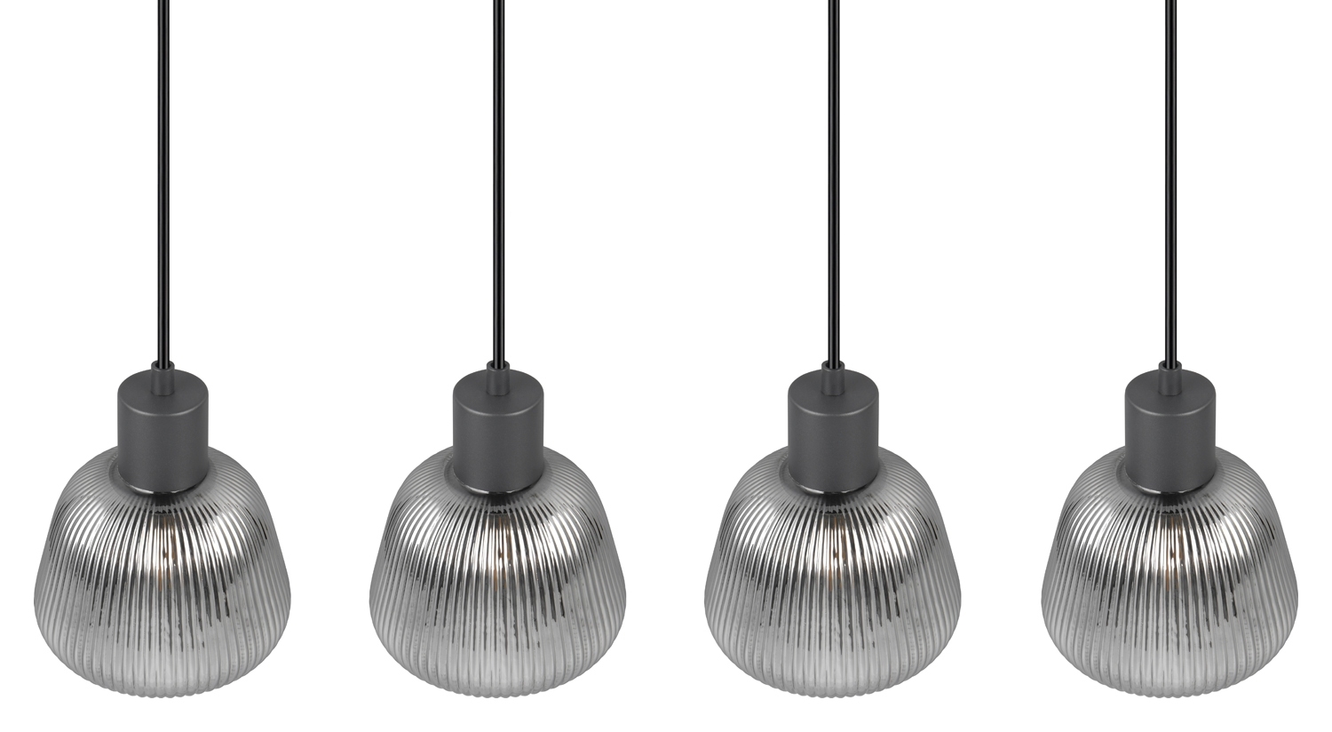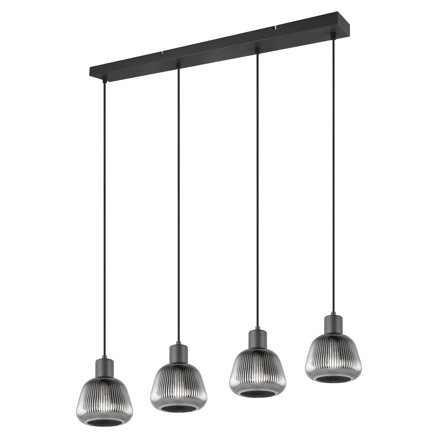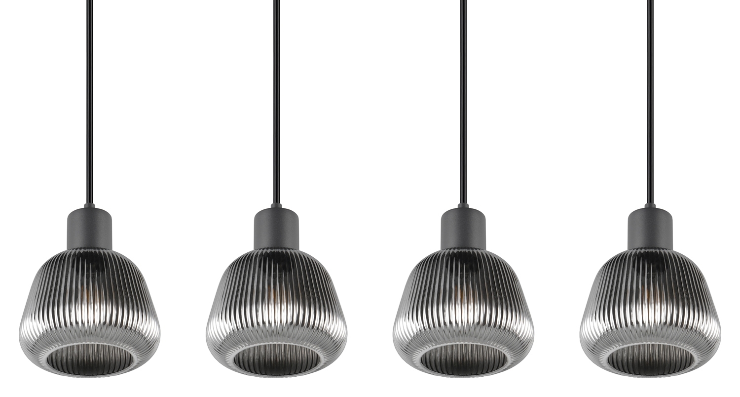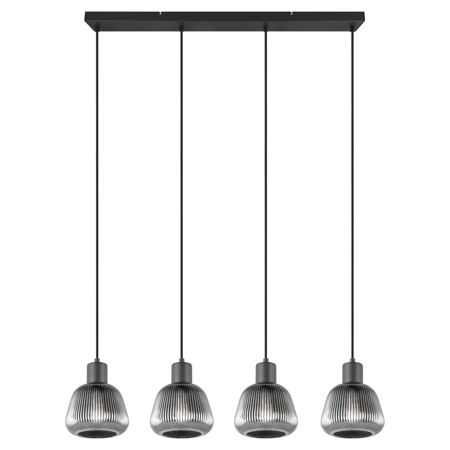 Die Pendelleuchte TARIFA von TRIO Leuchten verbindet modernes Design mit Flexibilität. Gefertigt aus schwarzem Metall, wird sie durch chrombedampfte Rauchglas-Lampenschirme stilvoll ergänzt. Diese Lampenschirme sind in der Höhe verstellbar, was eine individuelle Anpassung ermöglicht. Mit einer Breite von 80 cm, einer Höhe von 150 cm und einer Tiefe von 15 cm bietet die Leuchte Platz für vier Leuchtmittel des Typs E27, die austauschbar sind. Die Leuchtmittel sind nicht im Lieferumfang enthalten und dürfen eine maximale Leistung von 40 Watt haben.