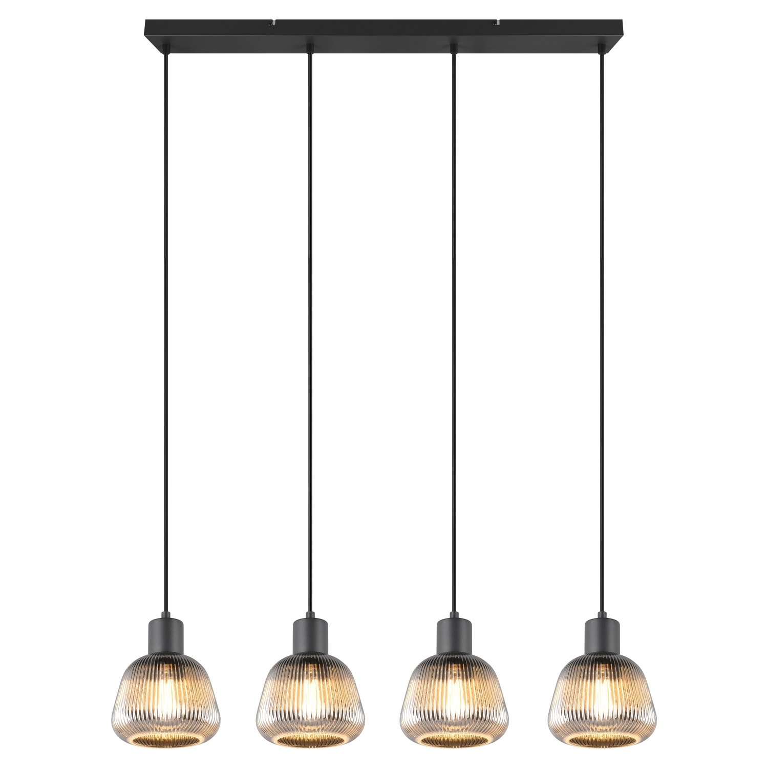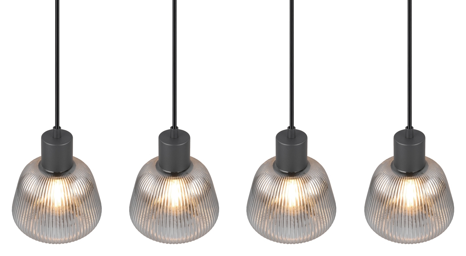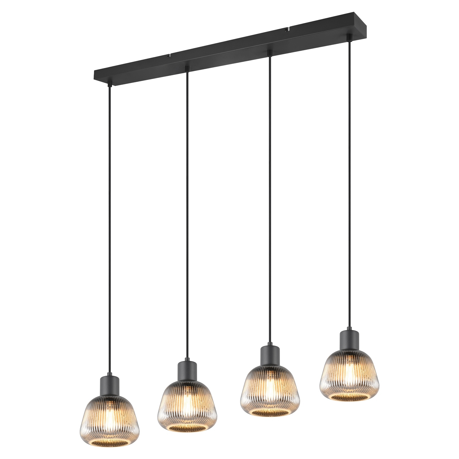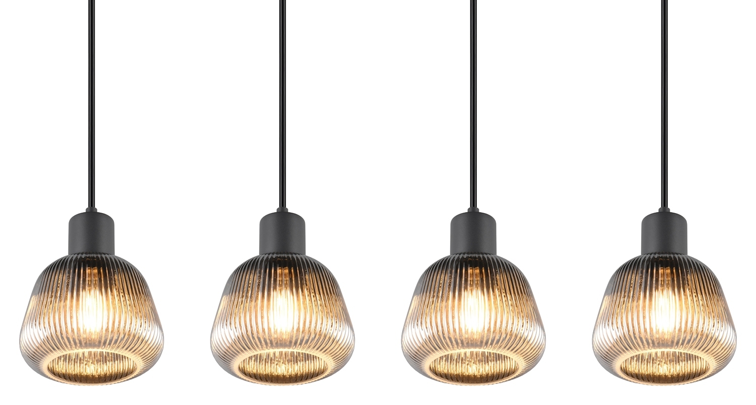 Die Pendelleuchte TARIFA von TRIO Leuchten verbindet modernes Design mit Flexibilität. Gefertigt aus schwarzem Metall, wird sie durch chrombedampfte Rauchglas-Lampenschirme stilvoll ergänzt. Diese Lampenschirme sind in der Höhe verstellbar, was eine individuelle Anpassung ermöglicht. Mit einer Breite von 80 cm, einer Höhe von 150 cm und einer Tiefe von 15 cm bietet die Leuchte Platz für vier Leuchtmittel des Typs E27, die austauschbar sind. Die Leuchtmittel sind nicht im Lieferumfang enthalten und dürfen eine maximale Leistung von 40 Watt haben.