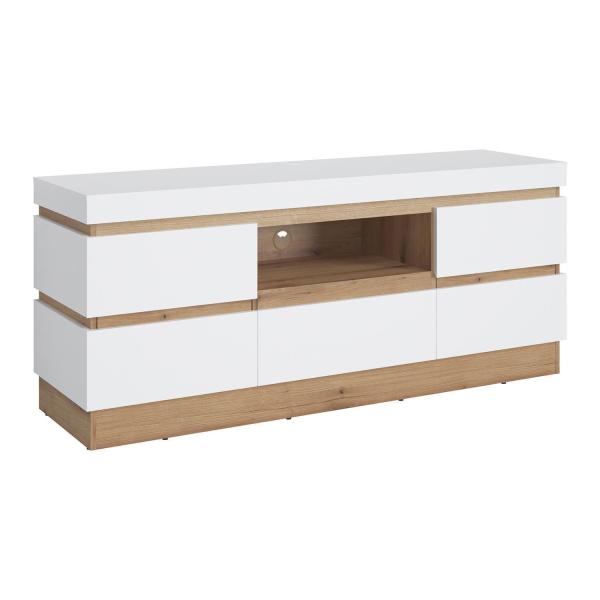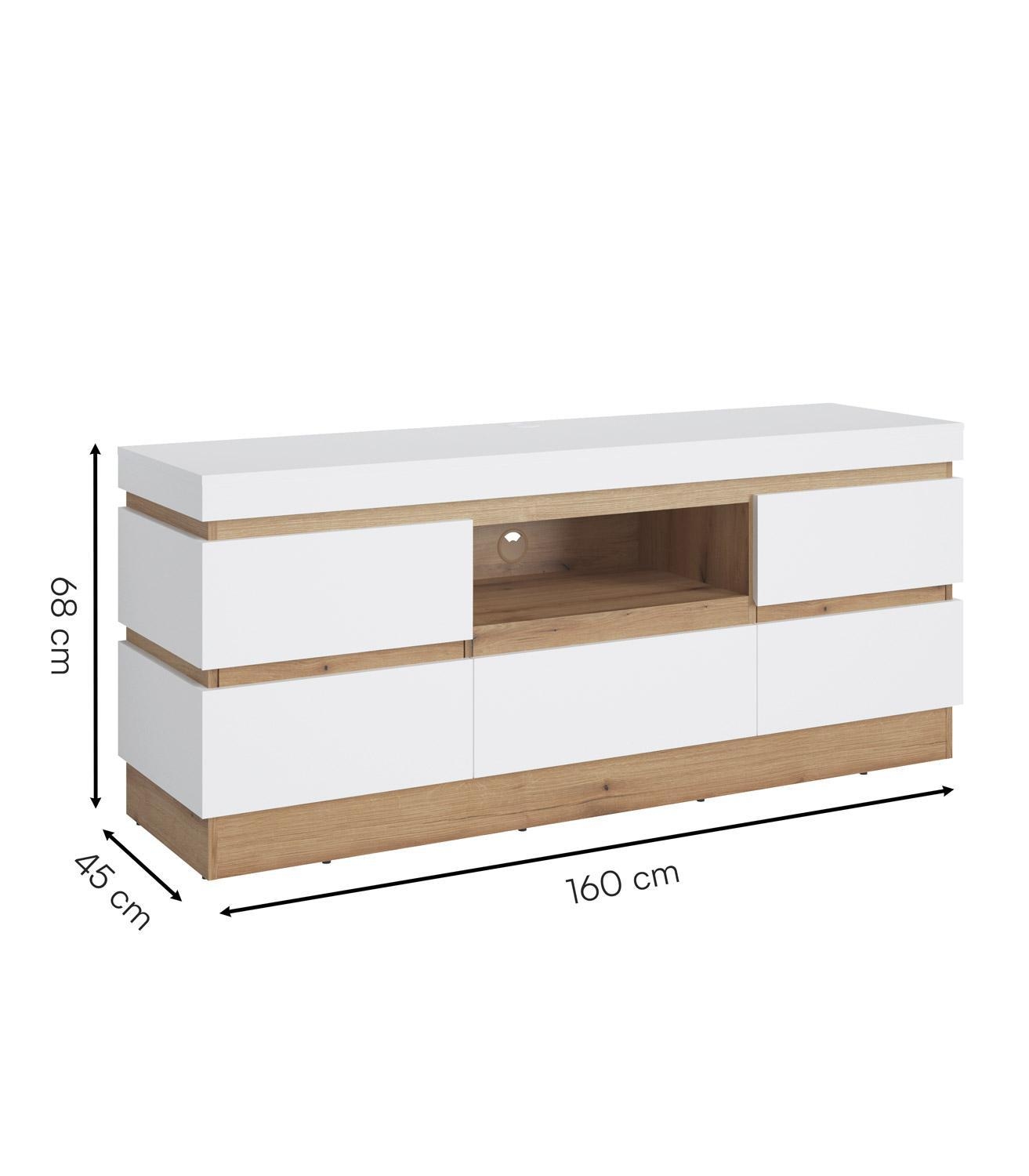 Das TV-Lowboard CALABRIA ist in Alpinweiß ausgeführt und verfügt über Absetzungen in Evoke Eiche Dekor. Es ist mit zwei Türen, einer Schublade sowie einem offenen Ablagefach mit Kabeldurchführung ausgestattet. Das Möbelstück wird ohne Beleuchtung geliefert. Die Breite beträgt 160 cm, die Höhe 68 cm und die Tiefe 45 cm.
