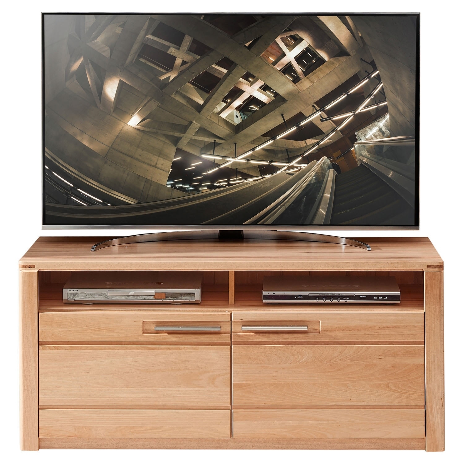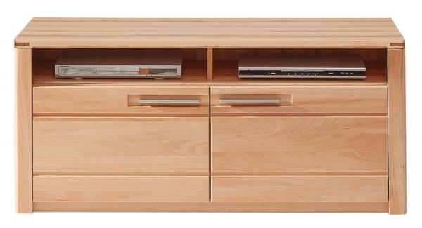 Das TV Lowboard NOVANA überzeugt mit seiner natürlichen Schönheit und praktischen Ausstattung. Der Korpus ist mit Kernbuche Dekor gestaltet, während die Fronten aus massivem Kernbuchenholz gefertigt sind. Es verfügt über zwei Holztüren, hinter denen sich jeweils zwei Holzböden befinden, ideal für die Aufbewahrung von Multimedia-Zubehör. Zusätzlich bietet es zwei Ablagefächer, die Platz für weitere Geräte oder Dekoration bieten. Mit einer Breite von 131 cm, einer Höhe von 58 cm und einer Tiefe von 45 cm bietet es ausreichend Platz für Ihren Fernseher und passt dennoch perfekt in verschiedene Wohnräume.