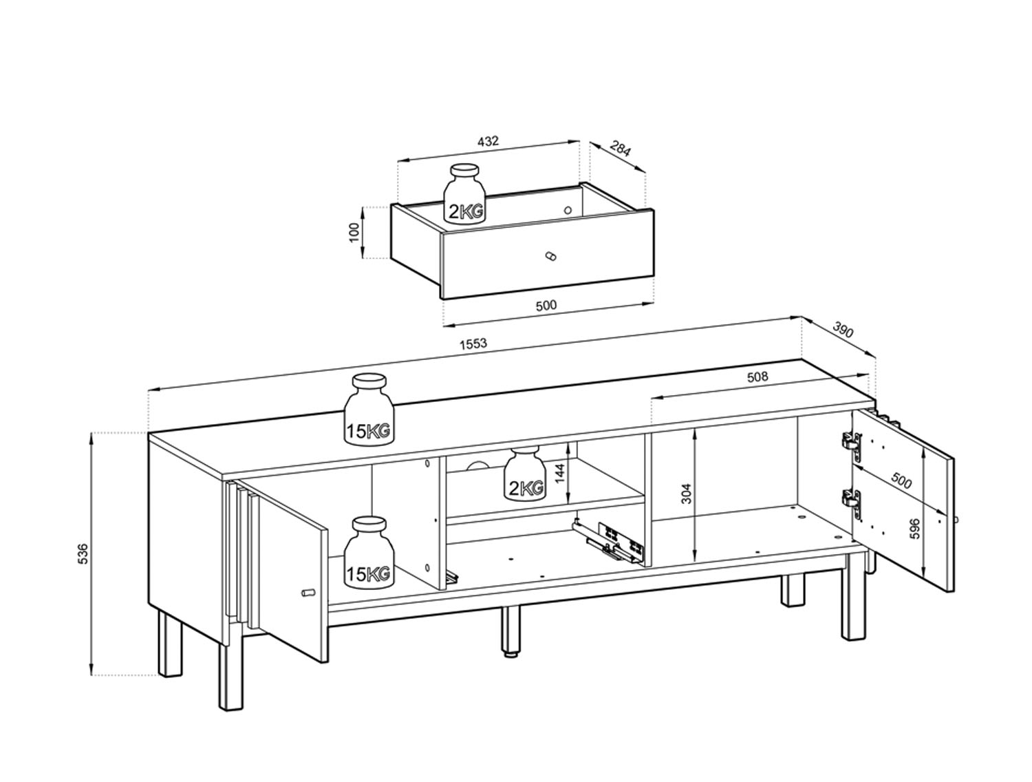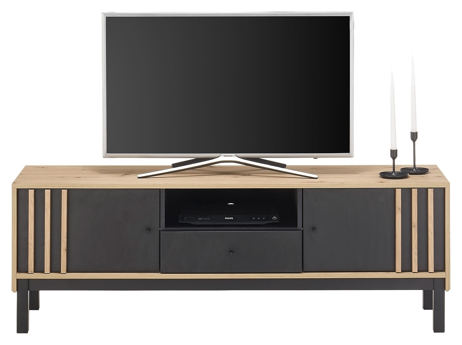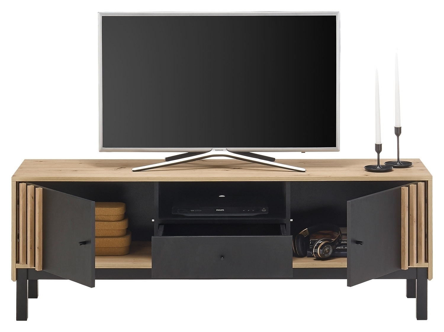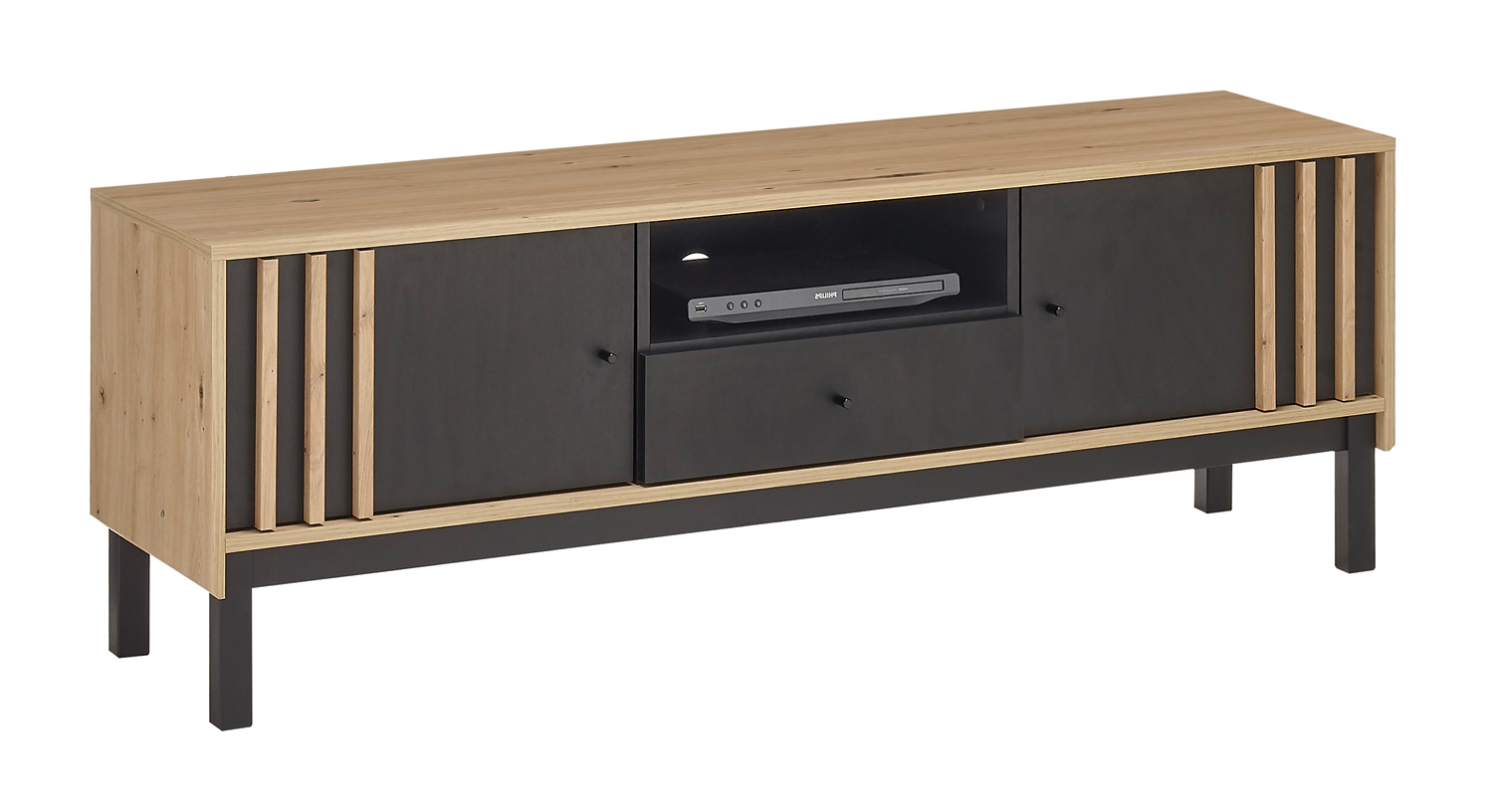 Das TV-Lowboard bietet mit 2 Türen, 1 Schublade und 1 offenen Fach mit Kabeldurchlass eine clevere Lösung für Ihr Wohnzimmer. Mit einer Breite von 155 cm, Höhe von 54 cm und Tiefe von 39 cm passt es perfekt für Ihren Fernseher und Multimedia-Geräte. Hergestellt aus Holzwerkstoff in Artisan Eiche Dekor und Schwarz, vereint es Funktionalität mit ansprechendem Design.