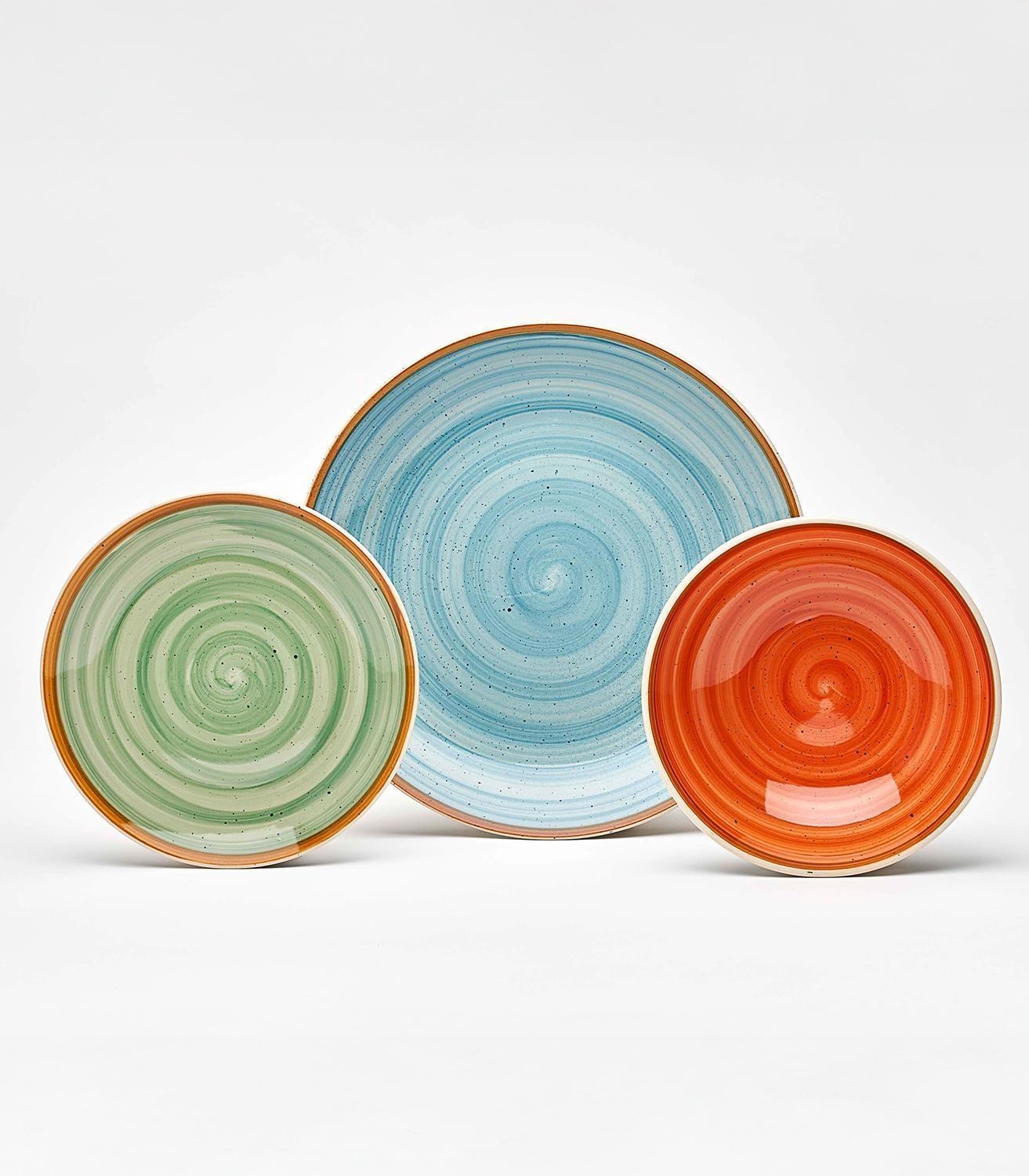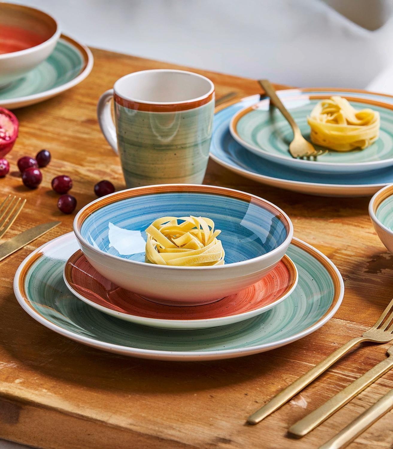 Das Kombiservice MAGNIFICA von der Marke Van Well ist ein 24-teiliges Set aus Steingut, das für bis zu sechs Personen konzipiert ist. Die verschiedenfarbigen Komponenten weisen ein gestreiftes Muster auf. Das Set umfasst jeweils sechs Speiseteller, Frühstücksteller, Kaffeetassen und Müslischalen. Ein praktischer Vorteil ist die Eignung des gesamten Services für die Nutzung in der Mikrowelle sowie für die Reinigung in der Spülmaschine.