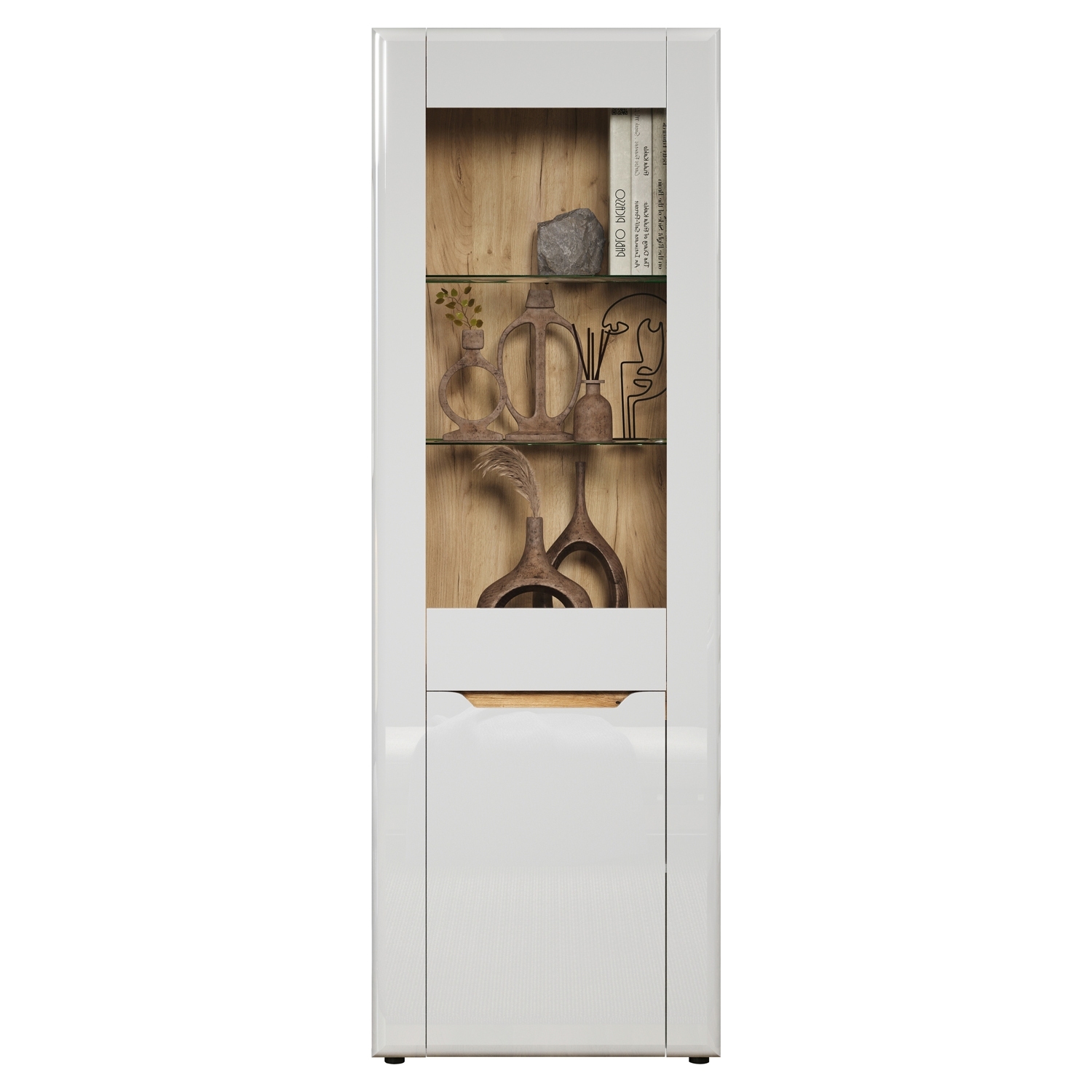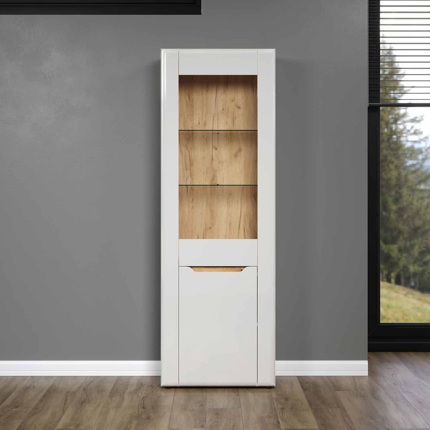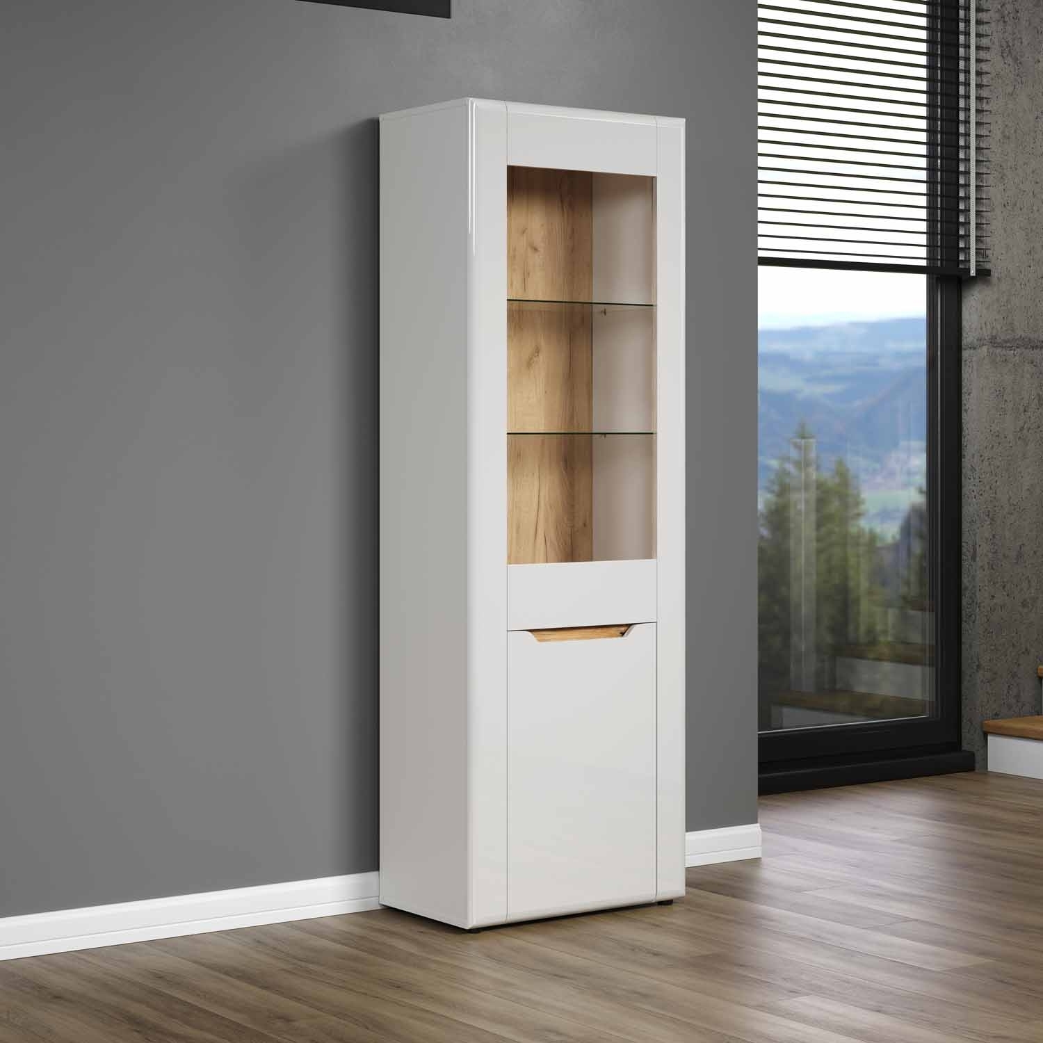 Die Vitrine in weiß Hochglanz mit Absetzungen in Evoke Eiche Dekor präsentiert sich als stilvolles Möbelstück für die Aufbewahrung und Präsentation. Mit einer Tür, die einen Glaseinsatz enthält, bietet sie einen transparenten Blick auf den Inhalt. Die Vitrine verfügt über 2 Glasböden, einen Einlegeboden und einen festen Boden für eine vielseitige und organisierte Präsentation von Dekorationsstücken oder persönlichen Gegenständen.