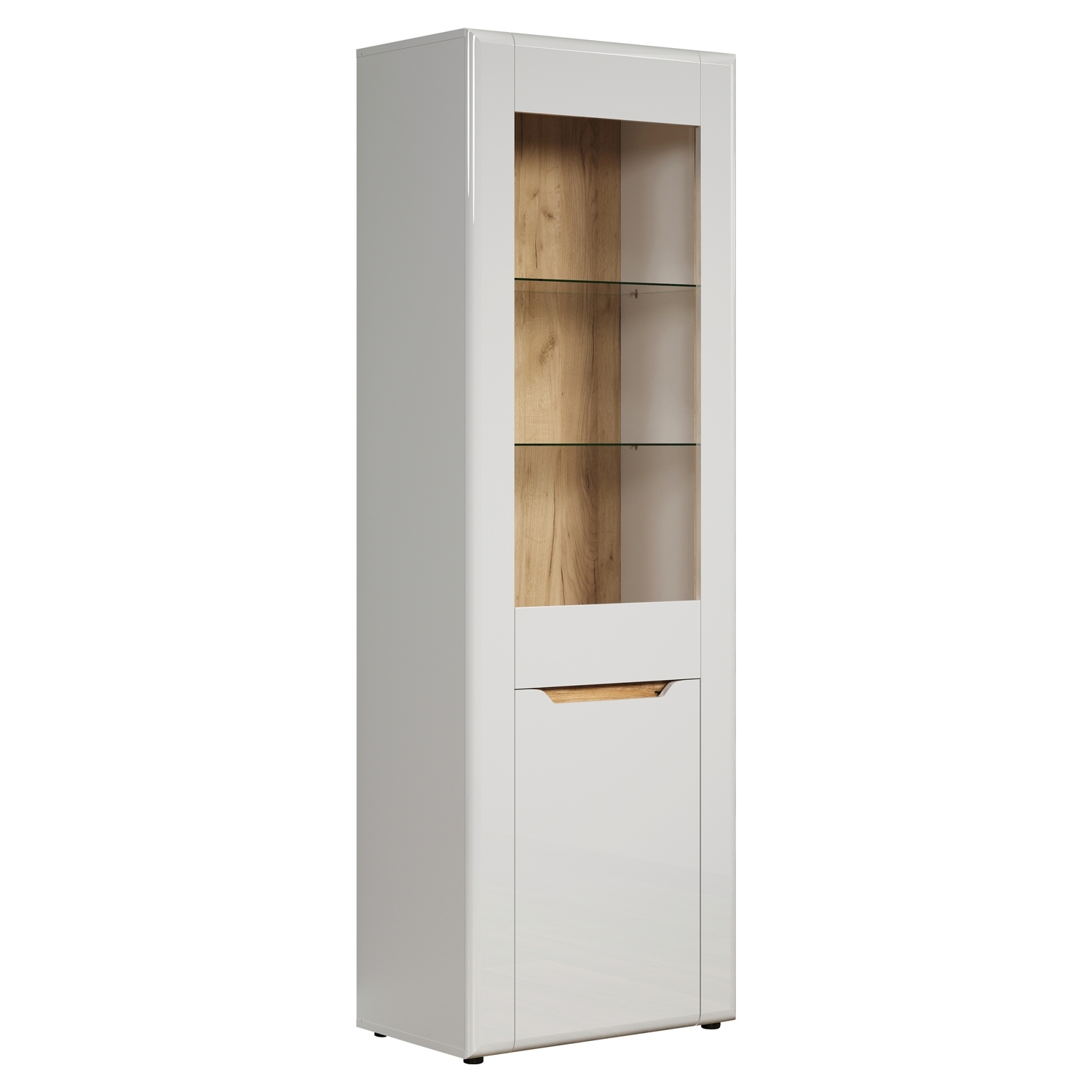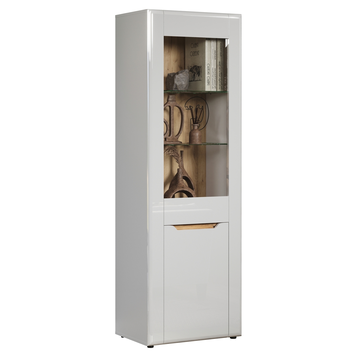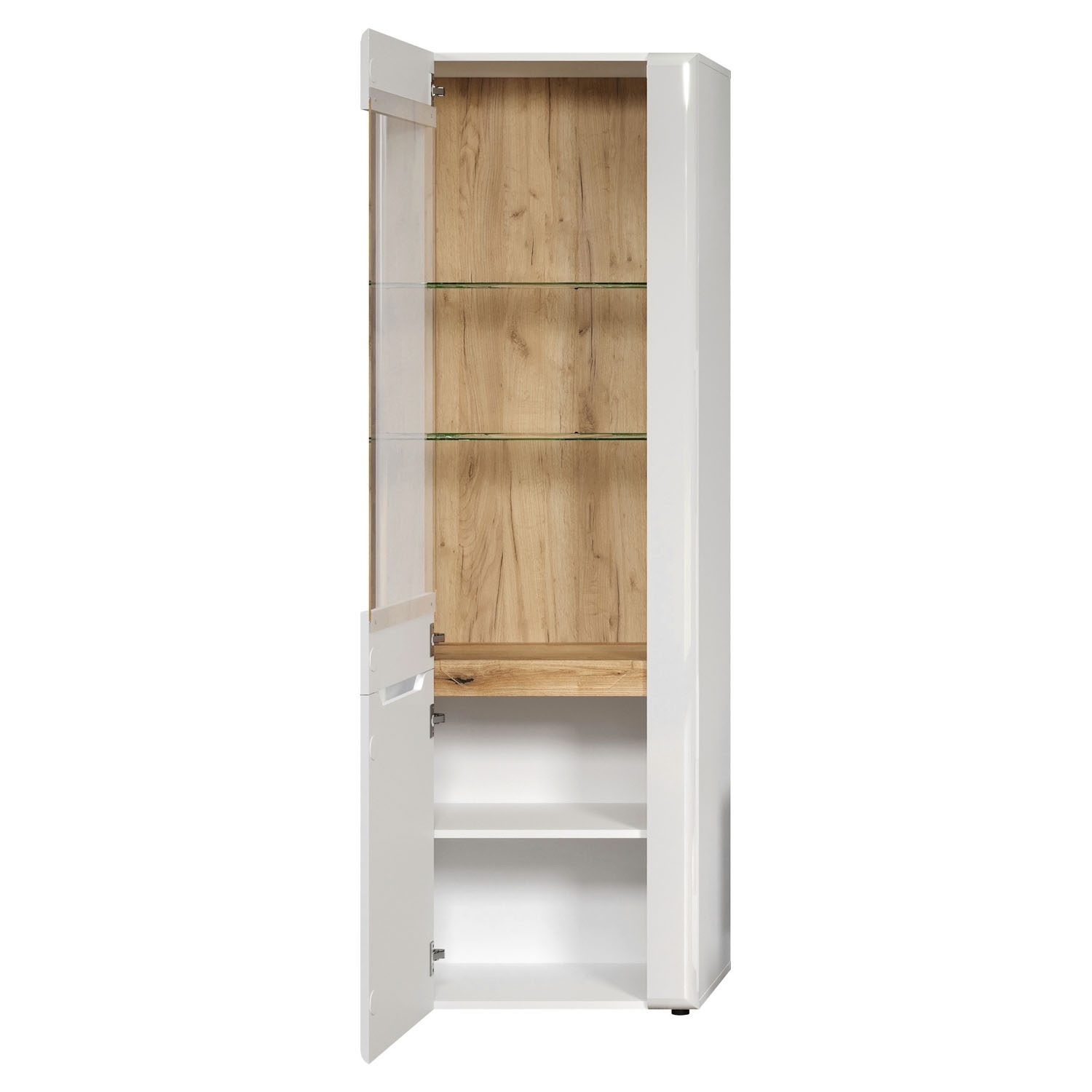 Die Vitrine in weiß Hochglanz mit Absetzungen in Evoke Eiche Dekor präsentiert sich als stilvolles Möbelstück für die Aufbewahrung und Präsentation. Mit einer Tür, die einen Glaseinsatz enthält, bietet sie einen transparenten Blick auf den Inhalt. Die Vitrine verfügt über 2 Glasböden, einen Einlegeboden und einen festen Boden für eine vielseitige und organisierte Präsentation von Dekorationsstücken oder persönlichen Gegenständen.