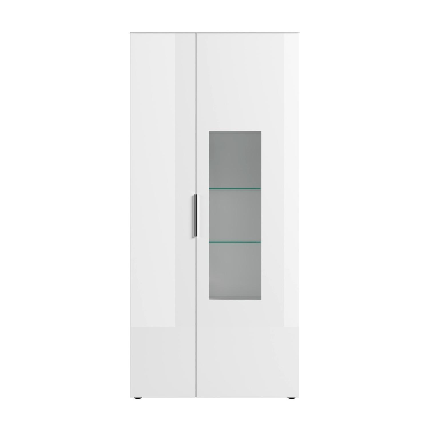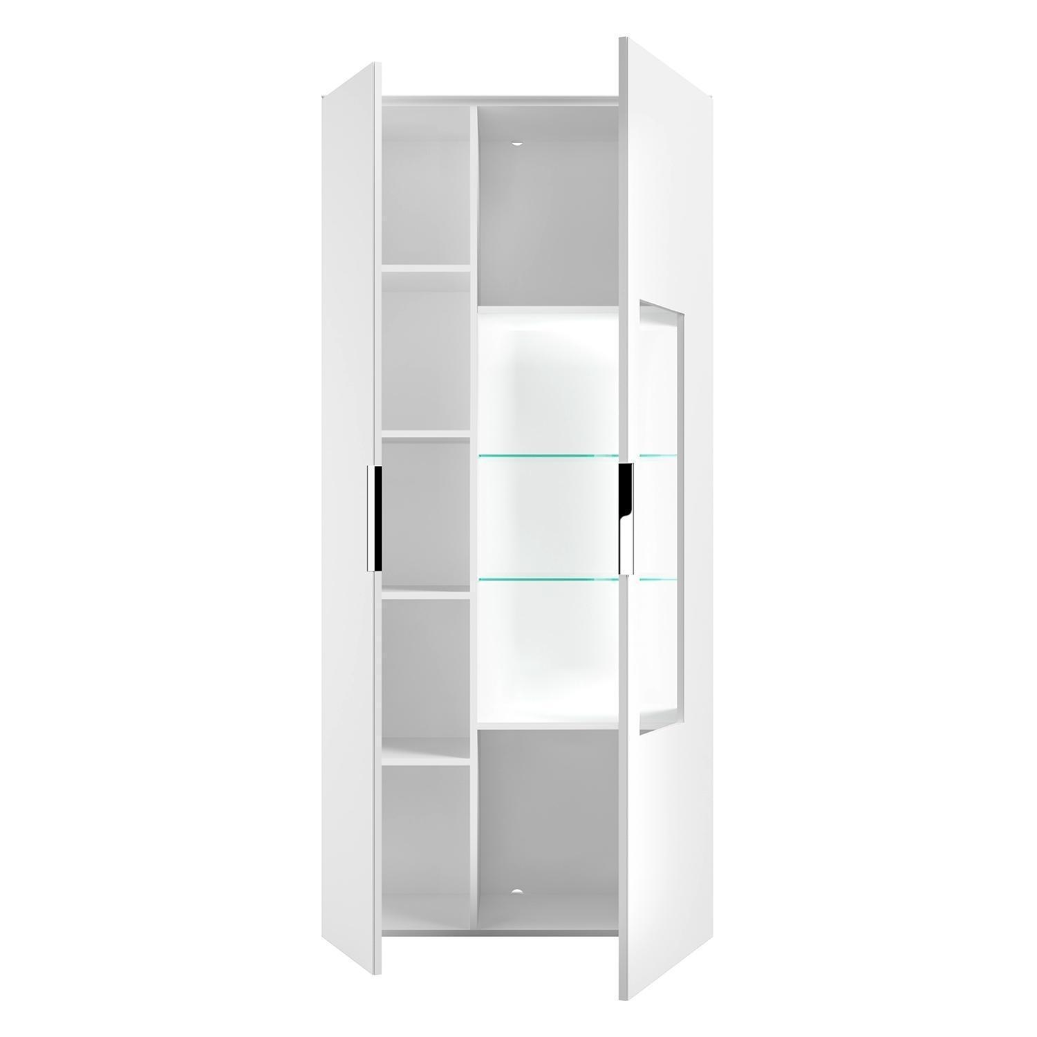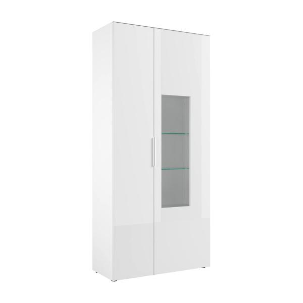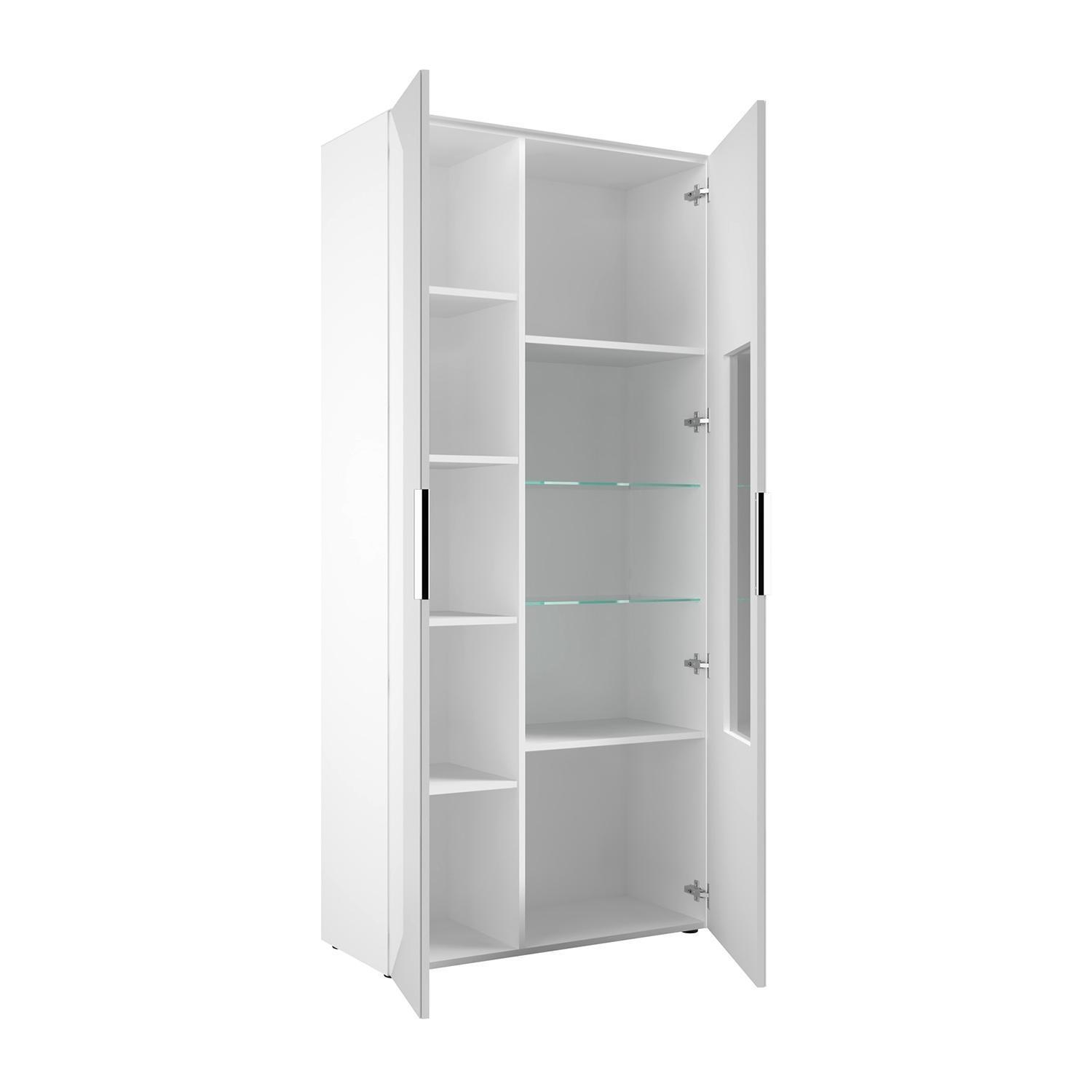 Die Vitrine SAKURA ist in Weiß matt gestaltet und verfügt über eine Teilfront aus Weißglas. Dieses Stauraummöbel ist mit einer geschlossenen Tür sowie einer Tür mit Glasteilfront ausgestattet. Im Inneren befinden sich zwei Glasböden und sechs Einlegeböden zur Unterbringung von Gegenständen. Eine integrierte LED-Beleuchtung gehört ebenfalls zur Ausstattung dieses Wohnzimmerschranks. Die Abmessungen belaufen sich auf eine Breite von 90 cm, eine Höhe von 197 cm und eine Tiefe von 40 cm.