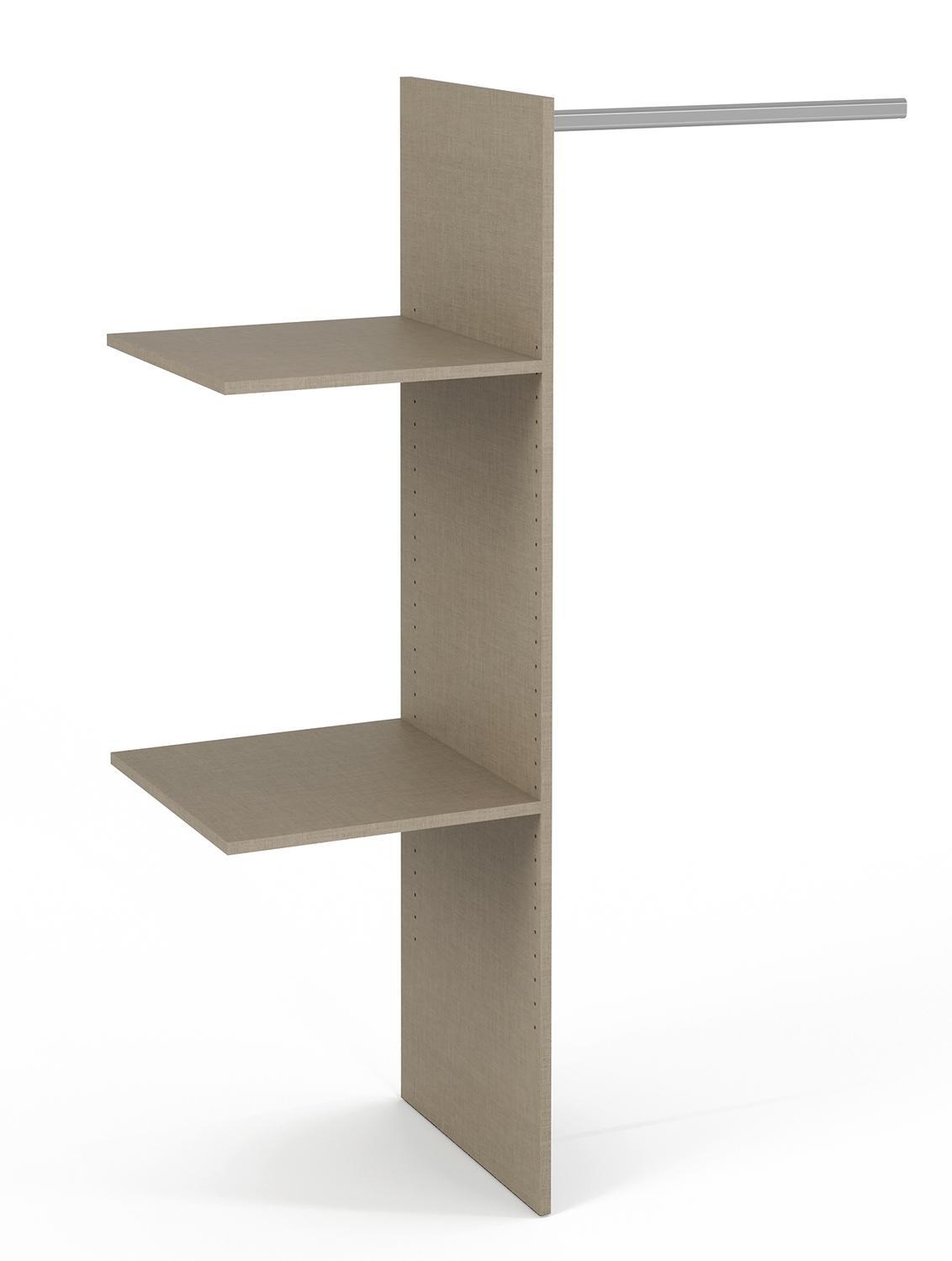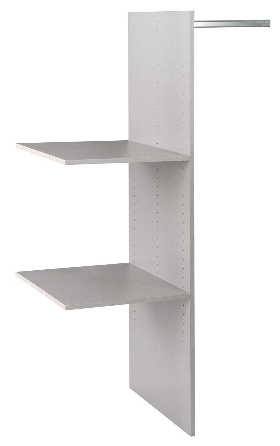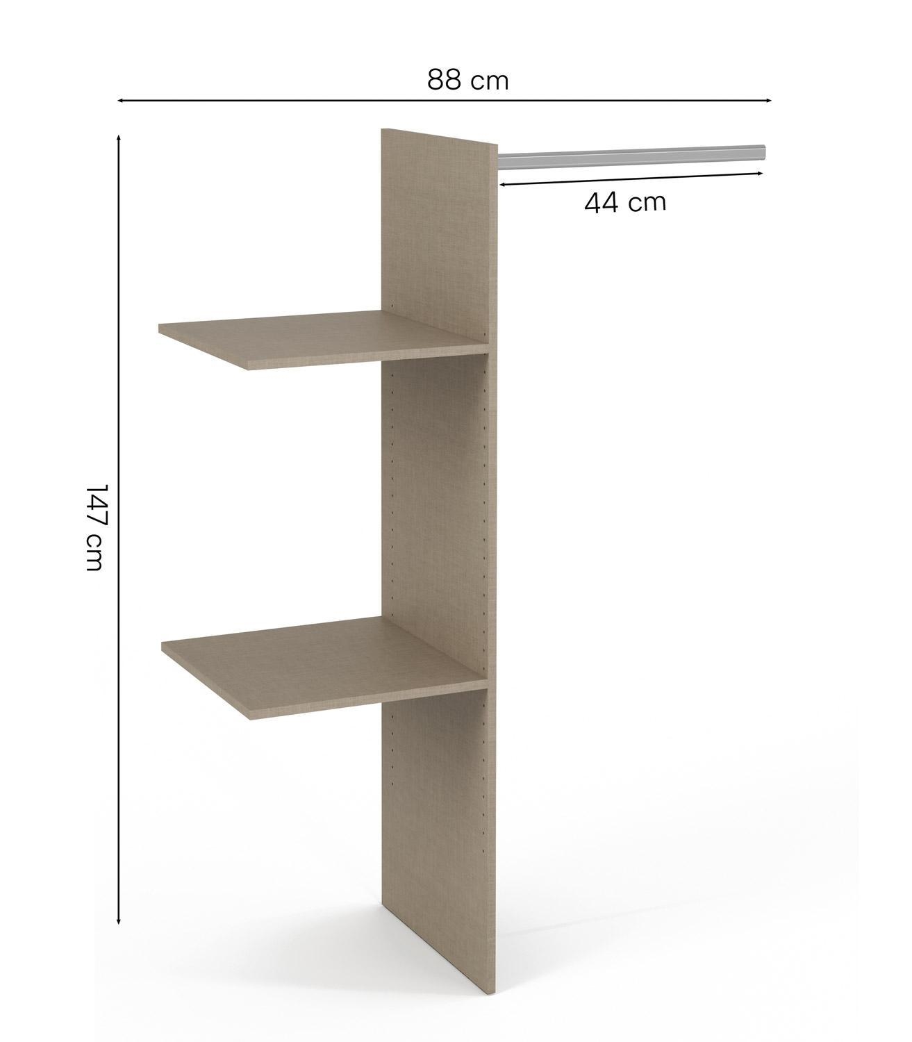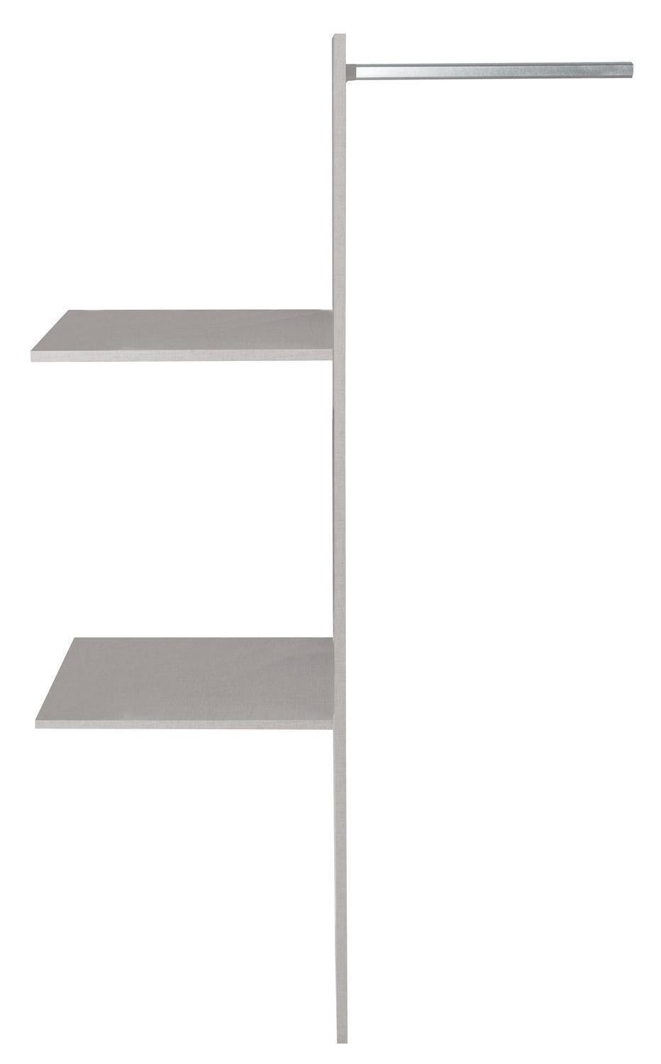 Das Set aus Einlegeboden und Kleiderstange eignet sich für gängige Kleiderschränke mit 90er Elementen. Diese Schrankeinteilung besteht aus einer vertikalen Trennwand an der eine Kleiderstangen und zwei verstellbare, praktische Einlegeböden befestigt werden. Die Oberfläche der Wand und jeder Einlegeboden sind mit einem Texline Dekor in der Farbe grau überzogen.