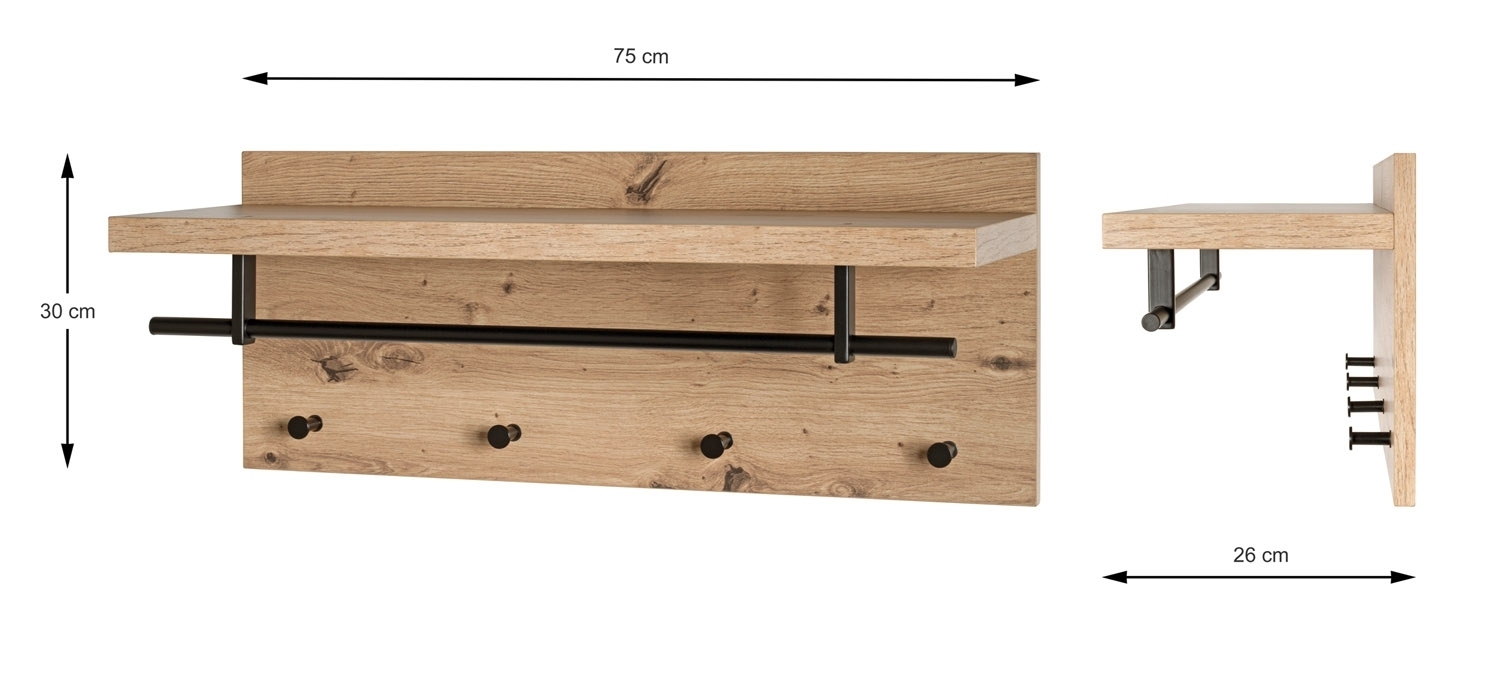 Schwarz - Artisan Eiche Dekor - 75 x 30 cm - Metall - mit Kleiderstange