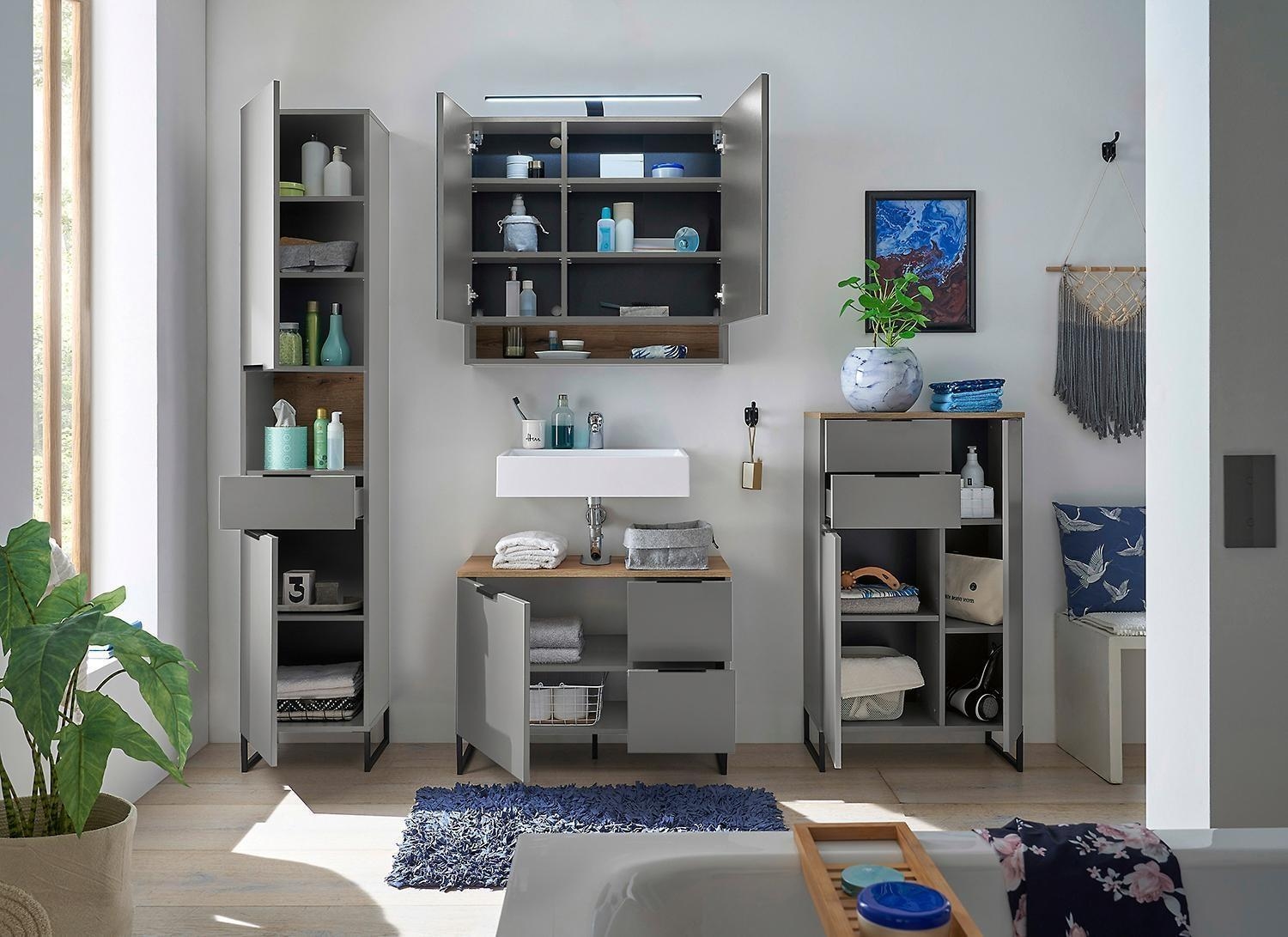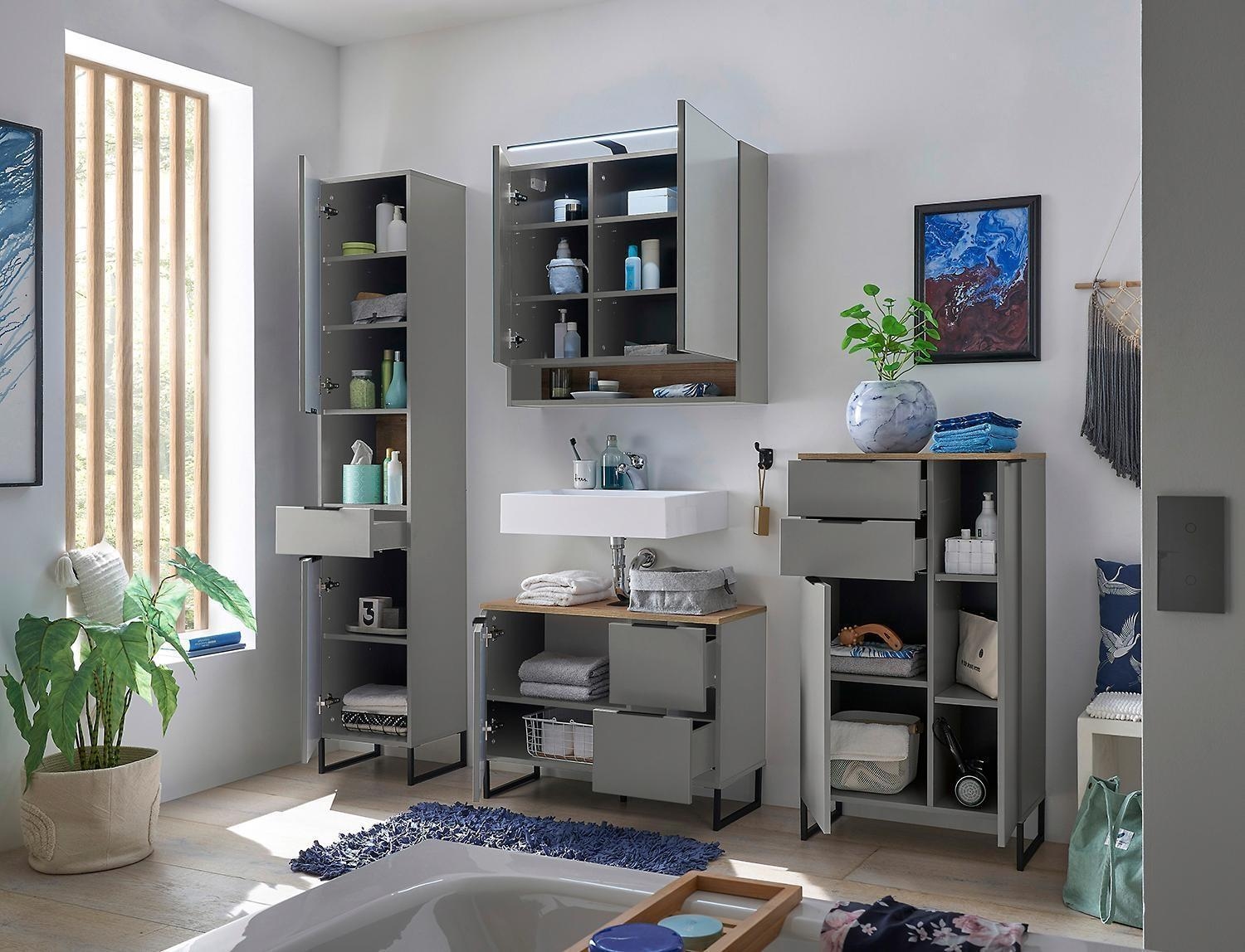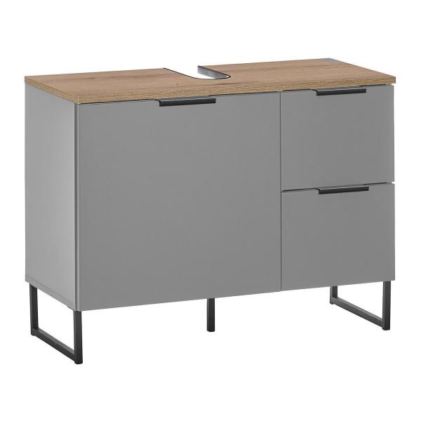 Der Waschbeckenunterschrank DENVER kombiniert eine graue Farbgebung mit einer Oberplatte im Dekor Evoke Eiche. Schwarze Metallelemente bilden das Gestell sowie die Griffe und setzen einen klaren Kontrast. Das Möbelstück verfügt über eine Tür und zwei Schubladen, ergänzt durch einen Einlegeboden, der sich in drei Höhen verstellen lässt. Mit einer Breite von 80 Zentimetern, einer Höhe von 60 Zentimetern und einer Tiefe von 35 Zentimetern passt der Schrank unter gängige Waschtische.