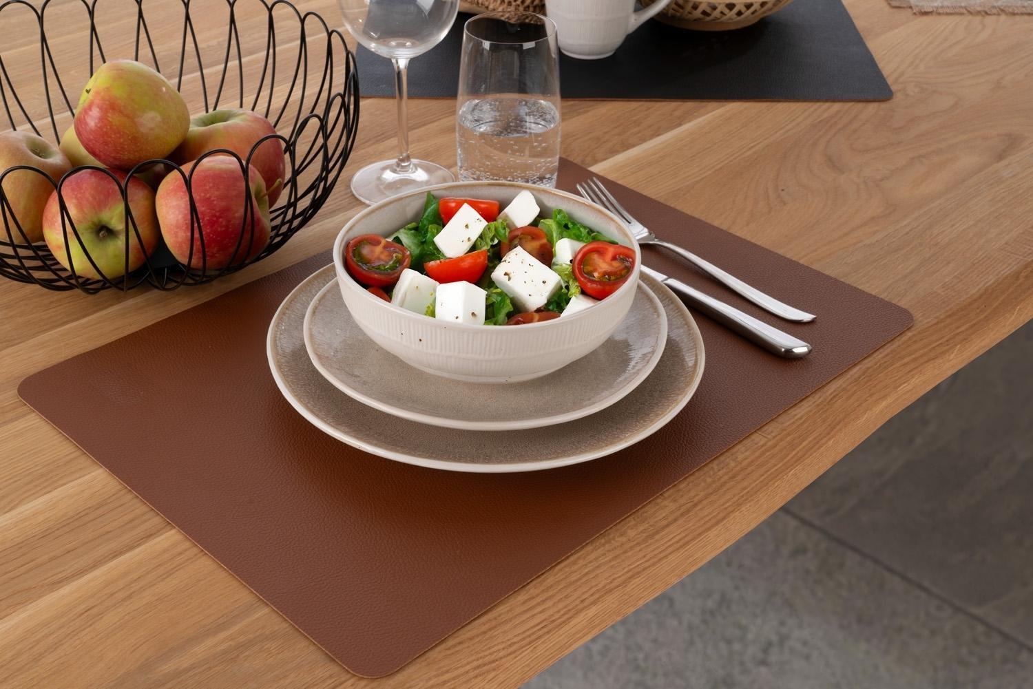 Das Wende-Tisch-Set LEATHER ist in Braun gehalten und hat eine schwarze Rückseite. Es besteht aus Kunstleder und dient als Unterlage für Geschirr, Gläser und Besteck. Die flexible Wendemöglichkeit bietet zwei Farboptionen für den Tisch. Das Set ist pflegeleicht und wird per Handwäsche gereinigt. Mit einer Länge von 46 cm und einer Breite von 33 cm ist es ideal für den täglichen Gebrauch.