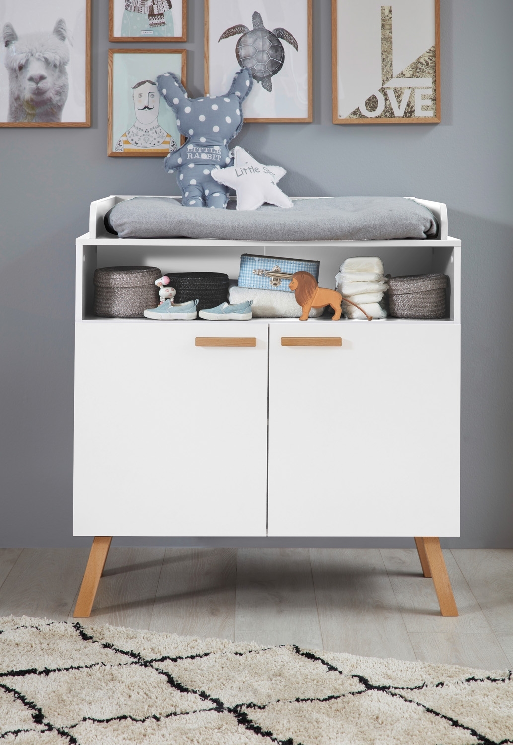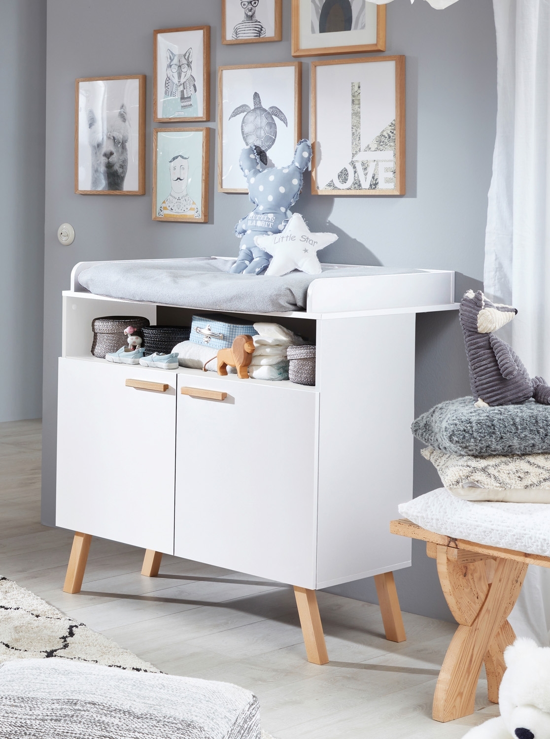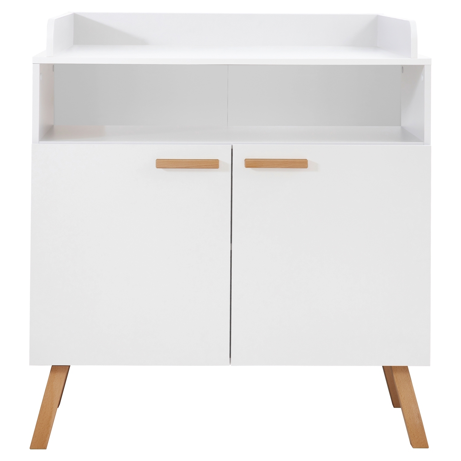 Die gelieferte Wickelkommode besteht aus 2 Türen, 2 Einlegeböden und einem praktischen Wickelaufsatz. In Weiß matt gehalten mit Absetzungen in Bianco Eiche Dekor, integriert sich das Möbelstück mühelos in verschiedene Raumkonzepte. Mit einer Höhe von 105 cm, einer Breite von 96 cm und einer Tiefe von 78 cm bietet die Kommode ausreichend Stauraum und Funktionalität. Hergestellt ist sie aus Holzwerkstoff. Beachten Sie, dass die Wickelauflage nicht im Lieferumfang enthalten ist.